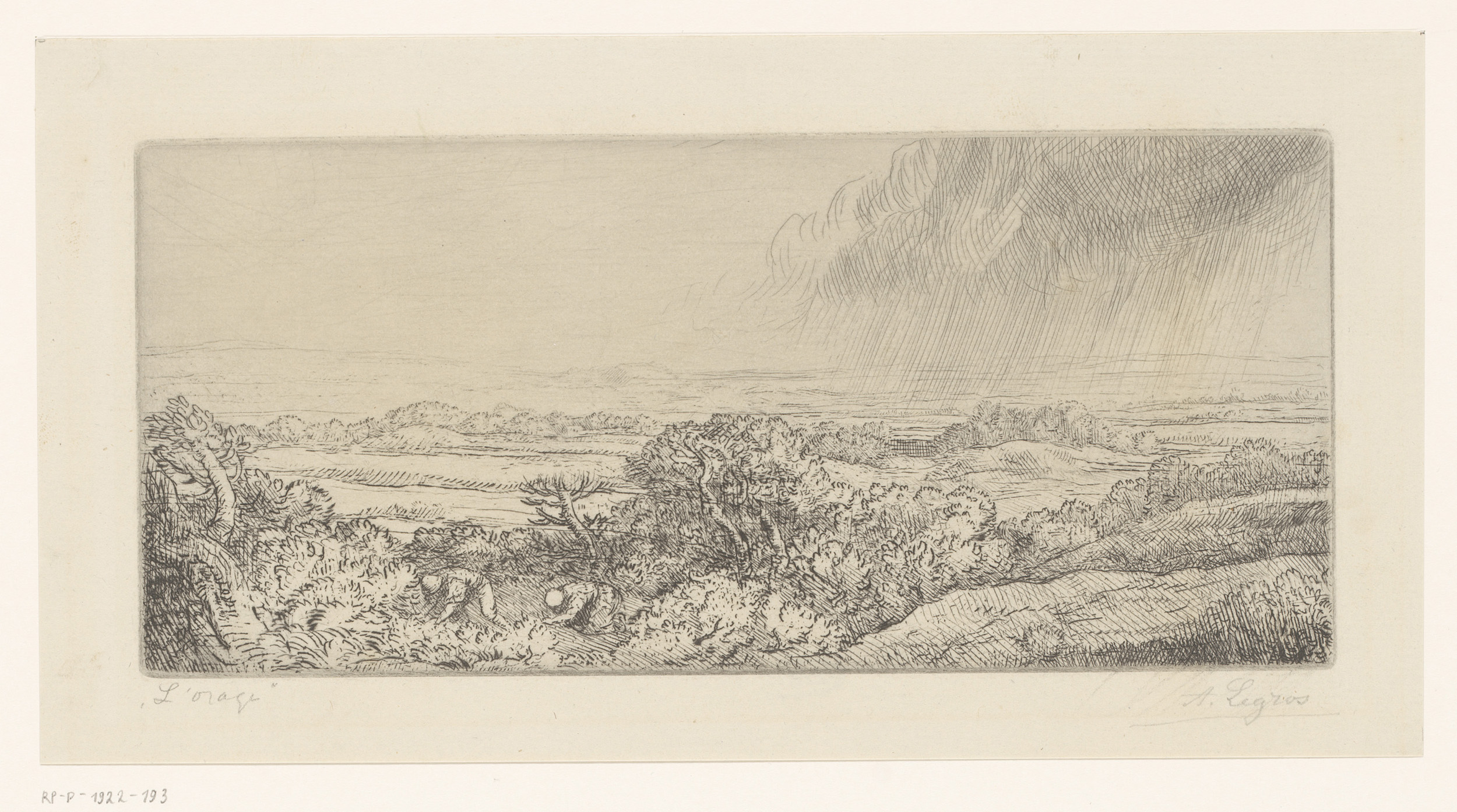 Landschap met twee figuren die langs het water wandelen