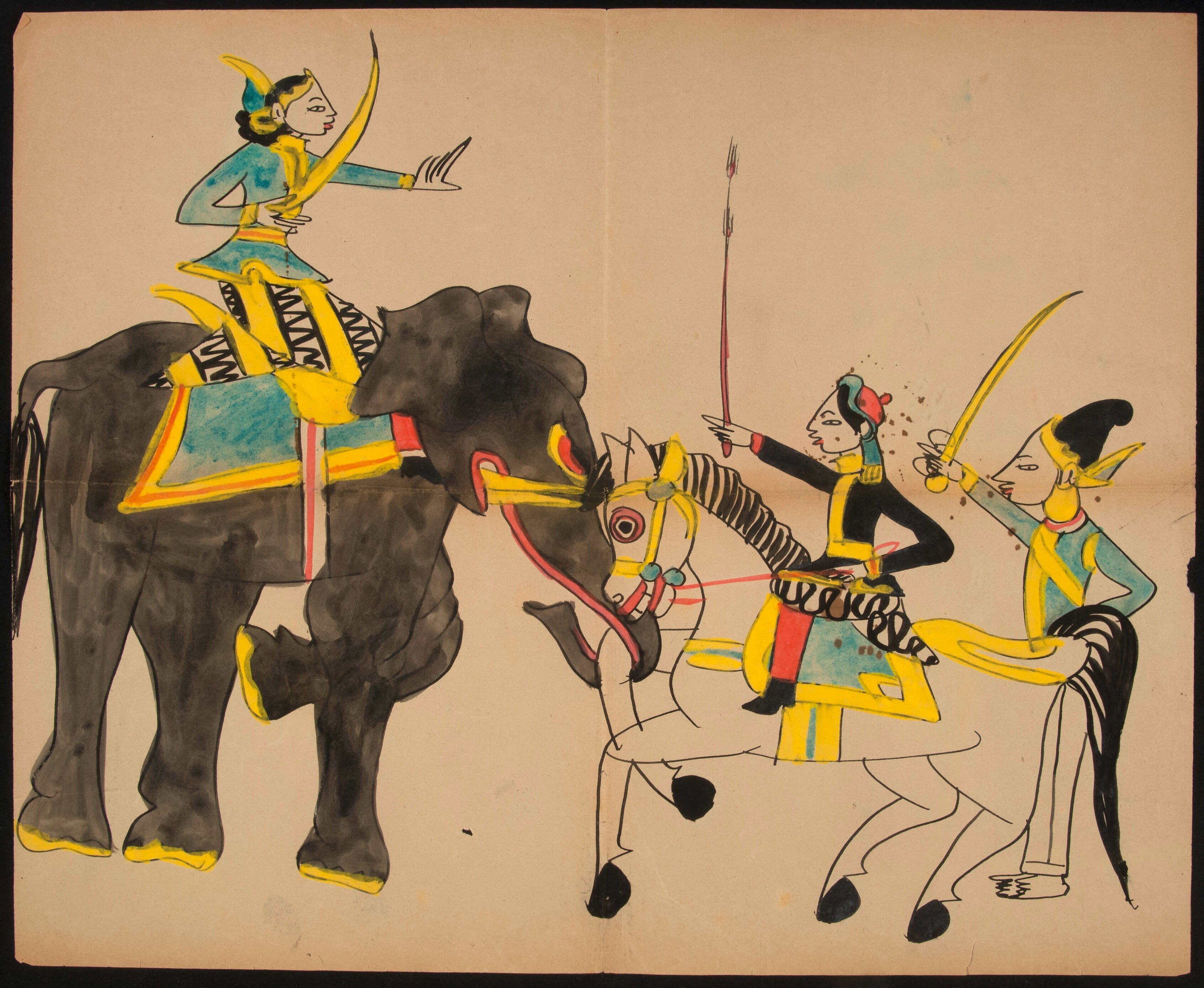 Een gevecht tussen een man op een olifant en een man...
