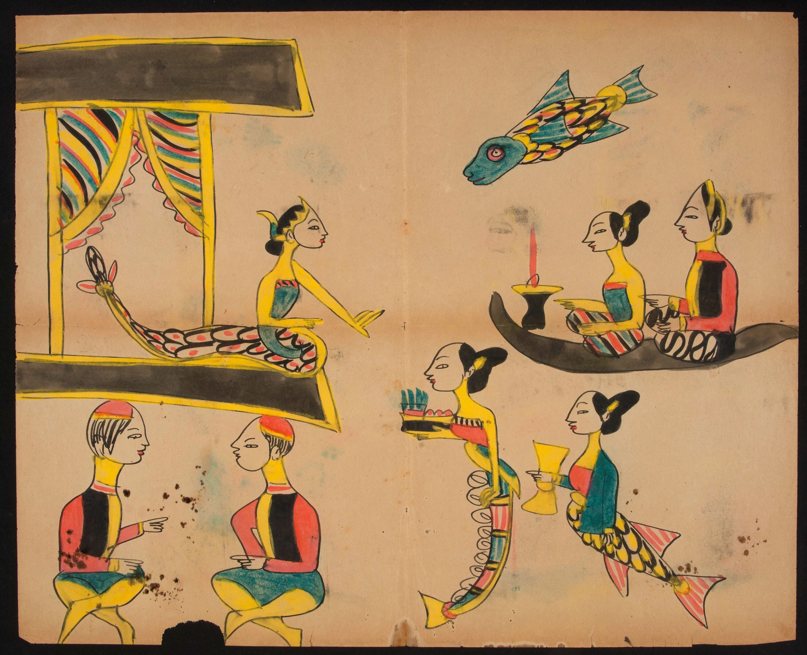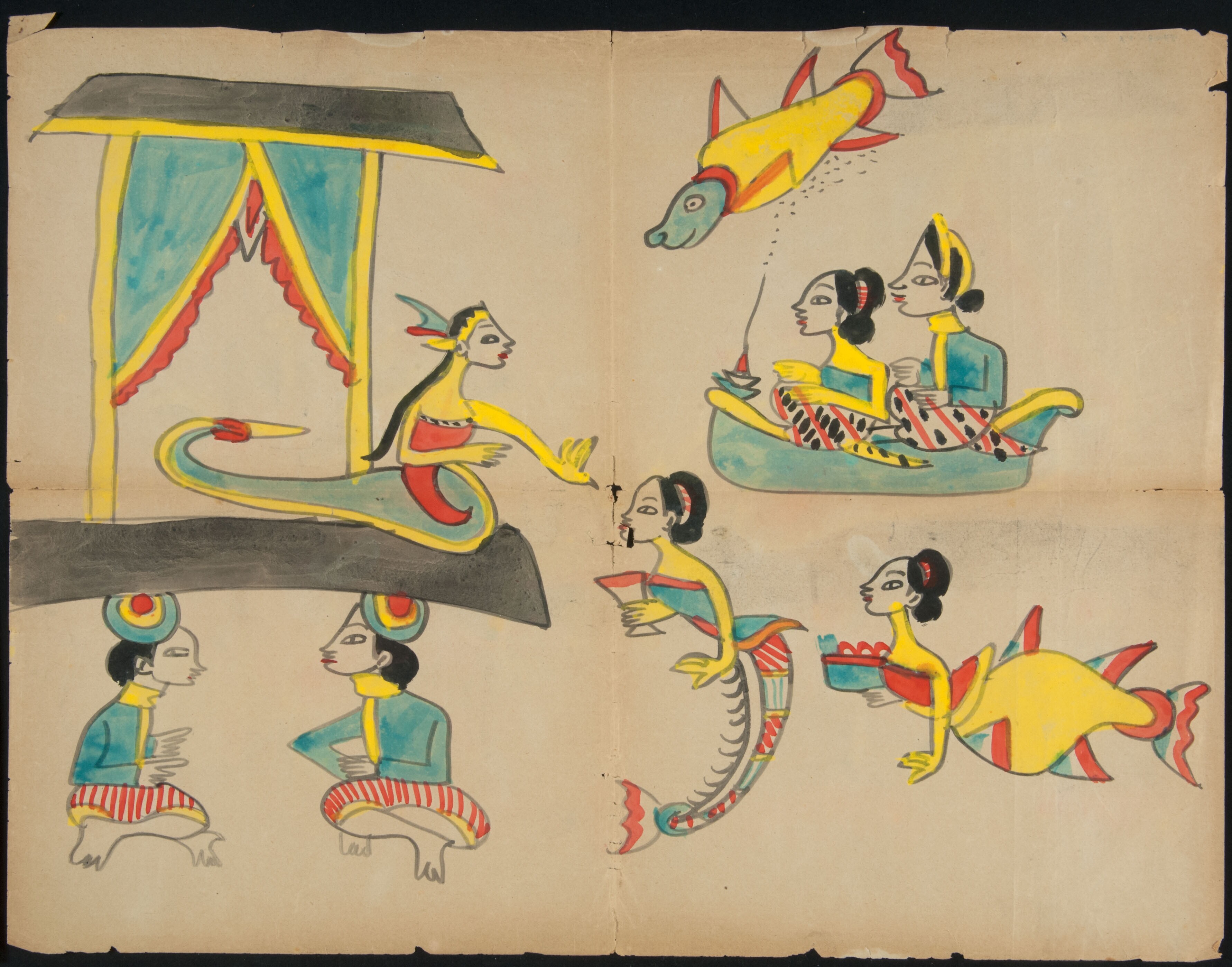 Zeemeerminnen met een bootje met een man en een vrouw