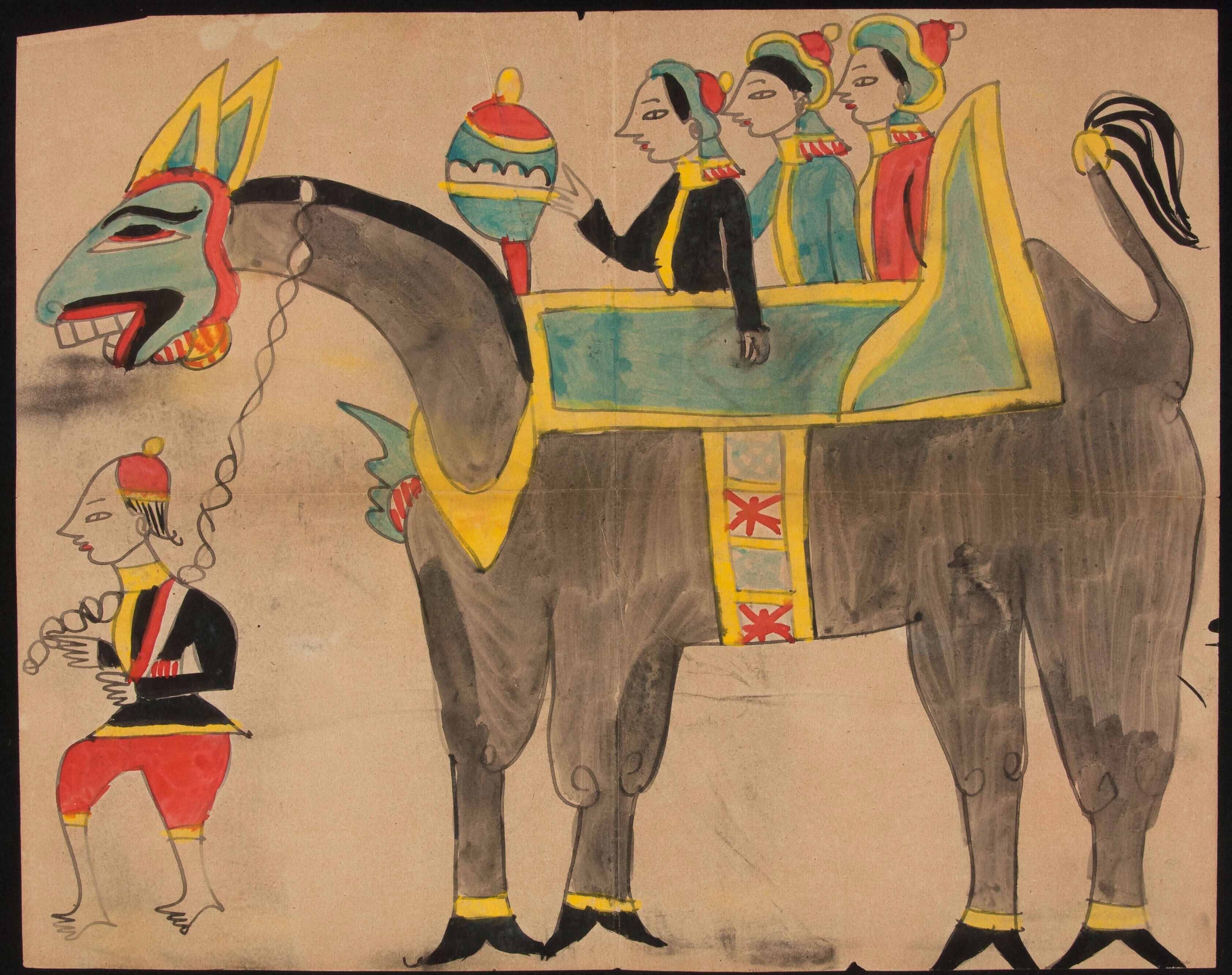 Drie mannen die op de rug van een mythisch dier zitten