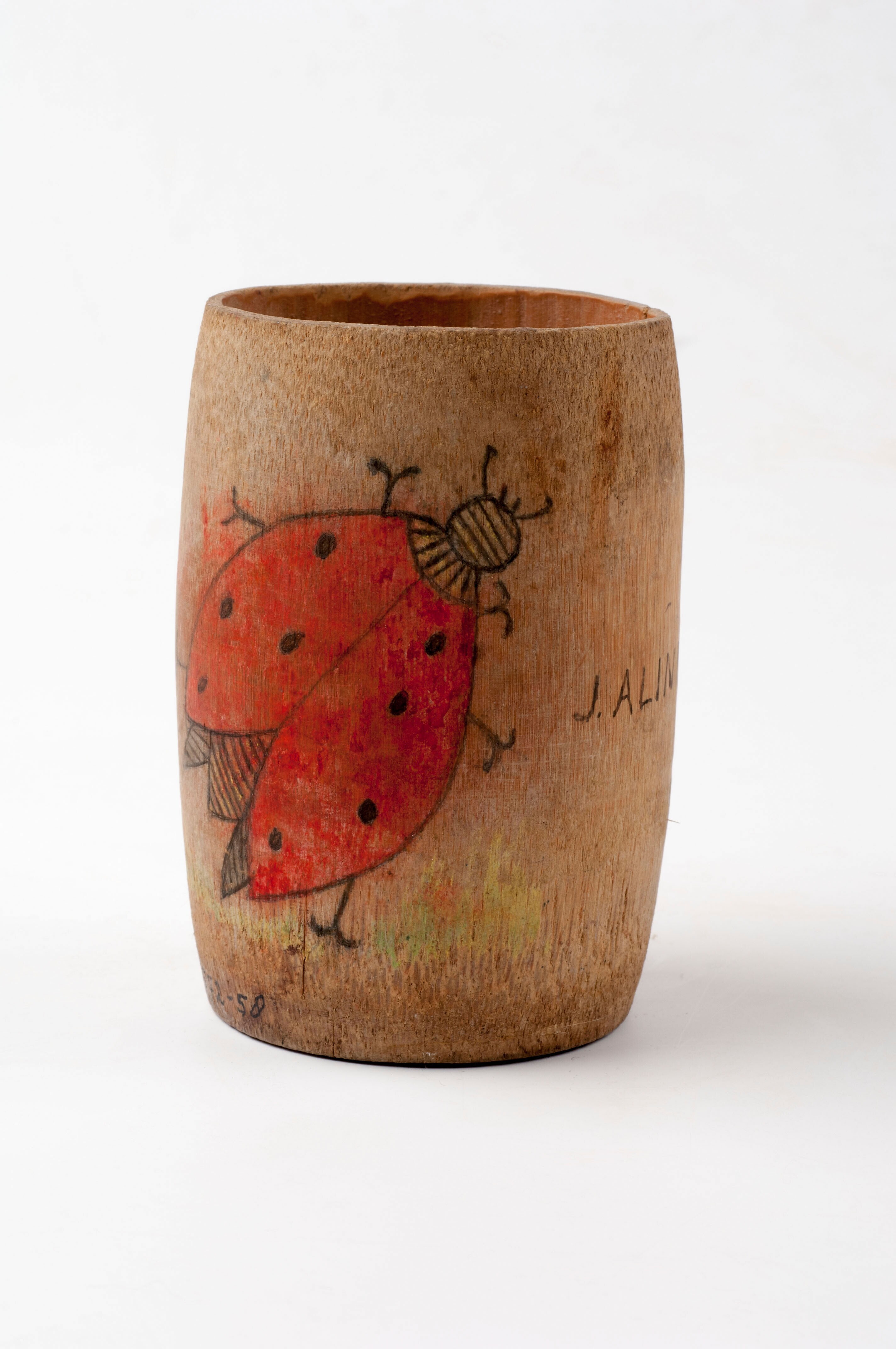 Spel bestaande uit tol (a) met etui van kokosschaal (b)