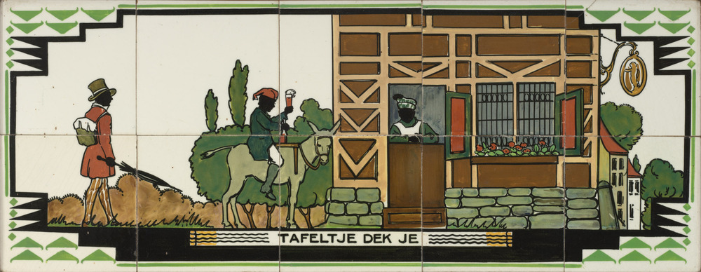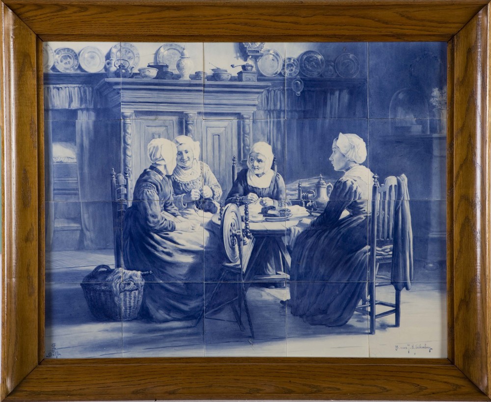 Tegeltableau met voorstelling van theedrinkende dame...