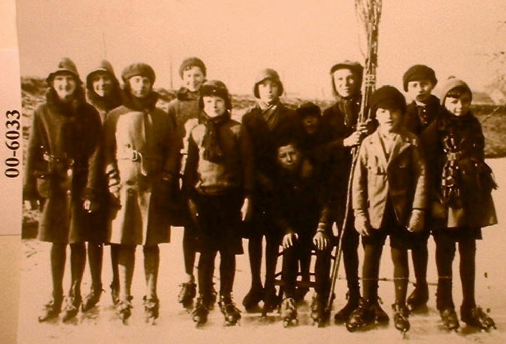 Twaalf kinderen op de Patersgracht aan het schaatsen