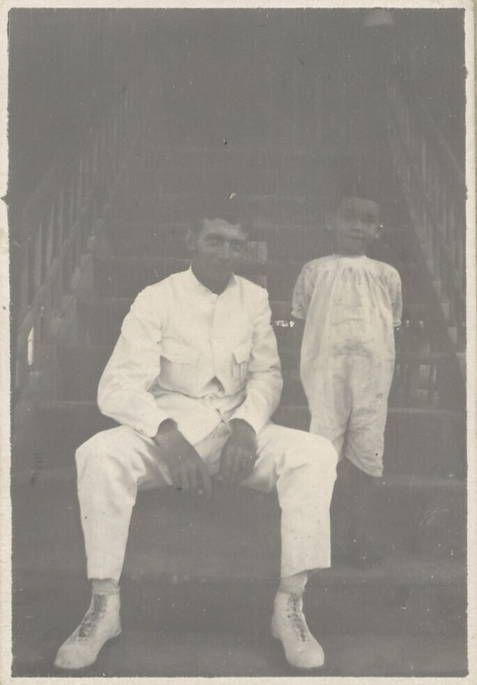 Hem Japing op de trap van het huis van de familie Du...
