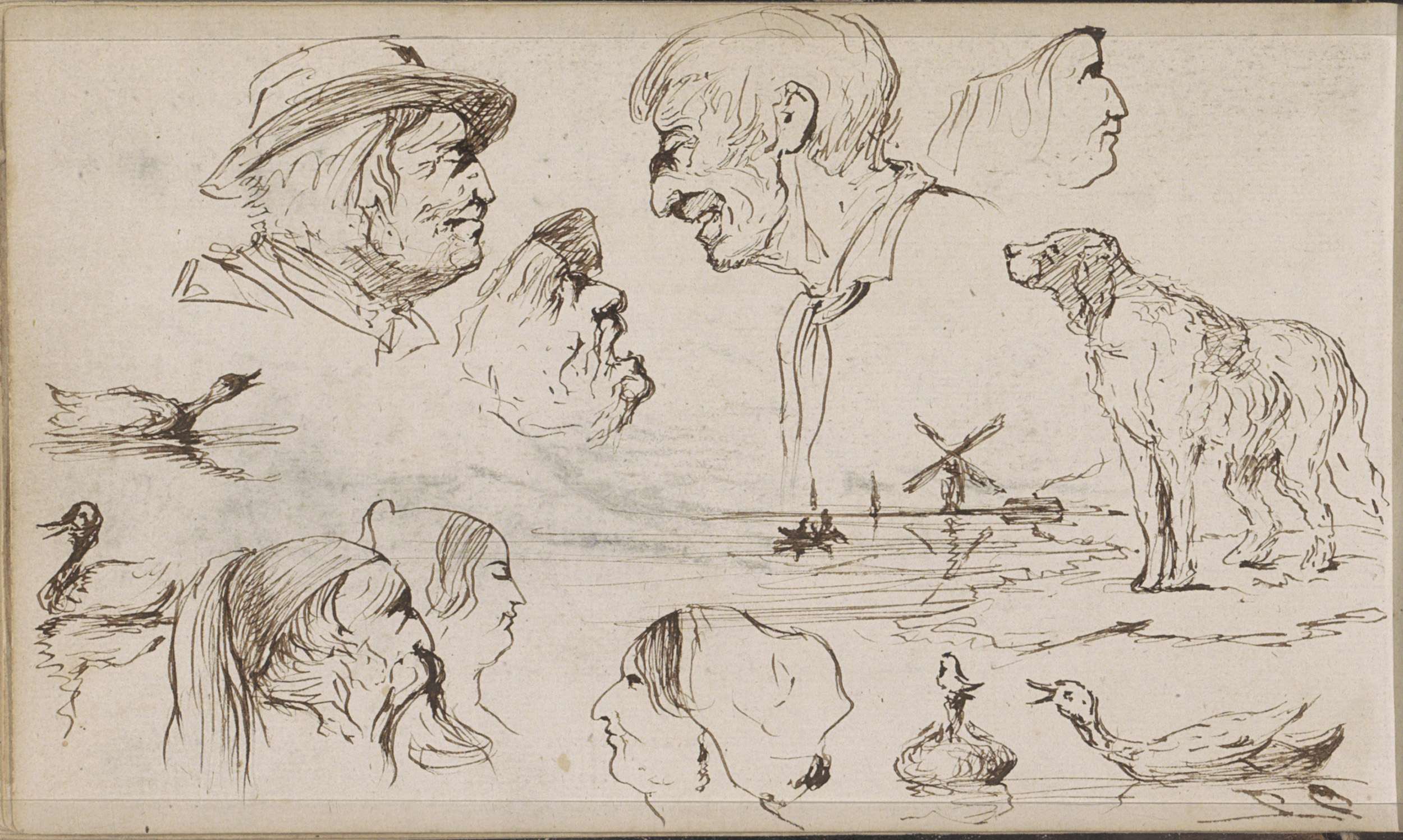 Eenden, koppen, een hond en een rivierlandschap met ...
