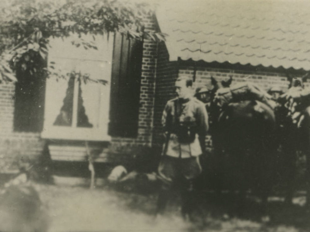 Foto Prins Bernhard voor boerderij met rechts twee p...