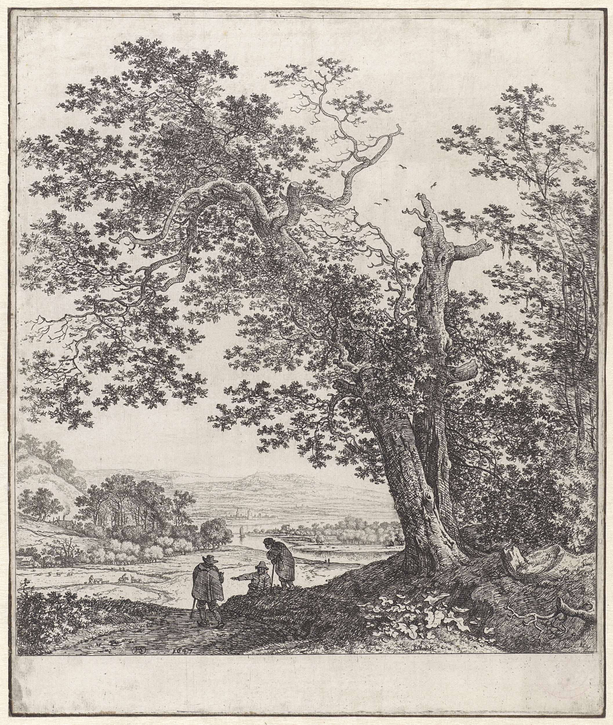 Drie figuren in een boomrijk rivierenlandschap