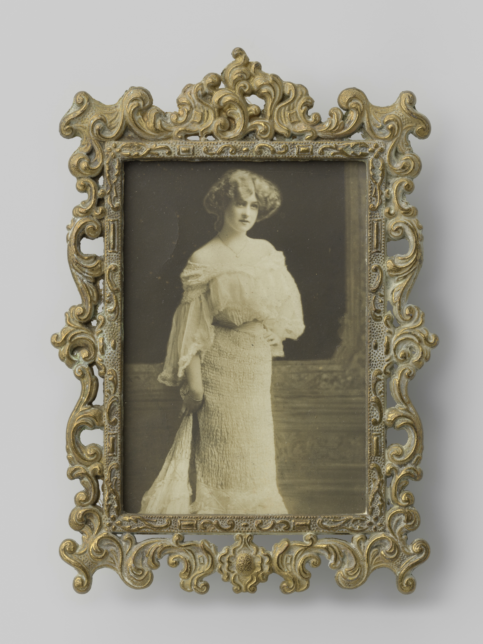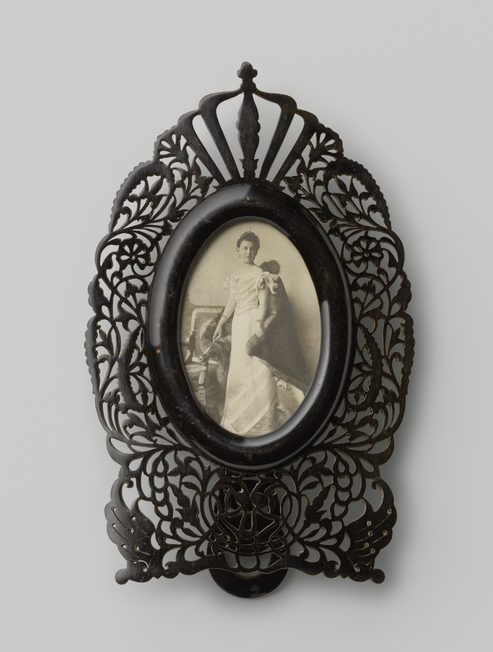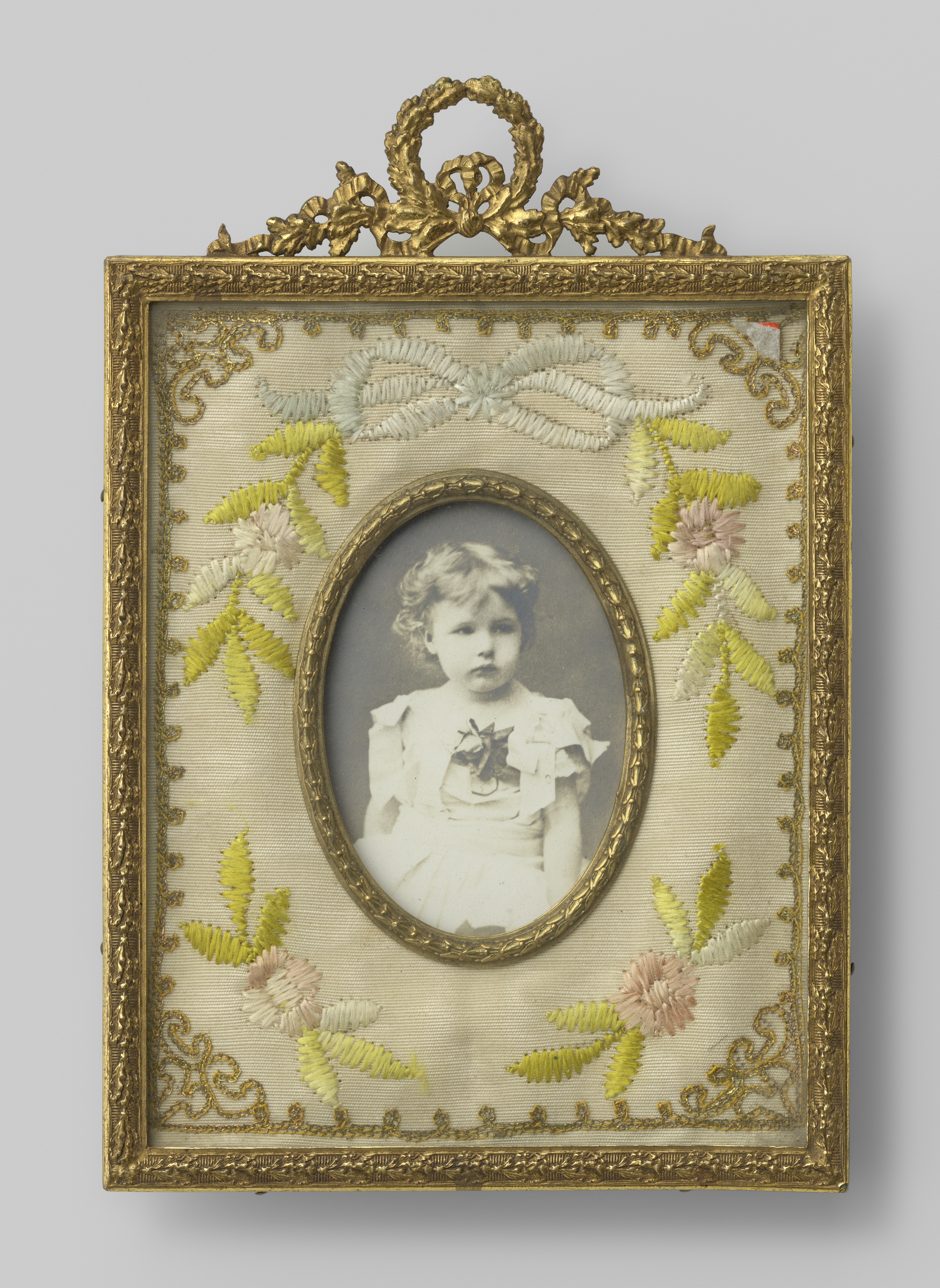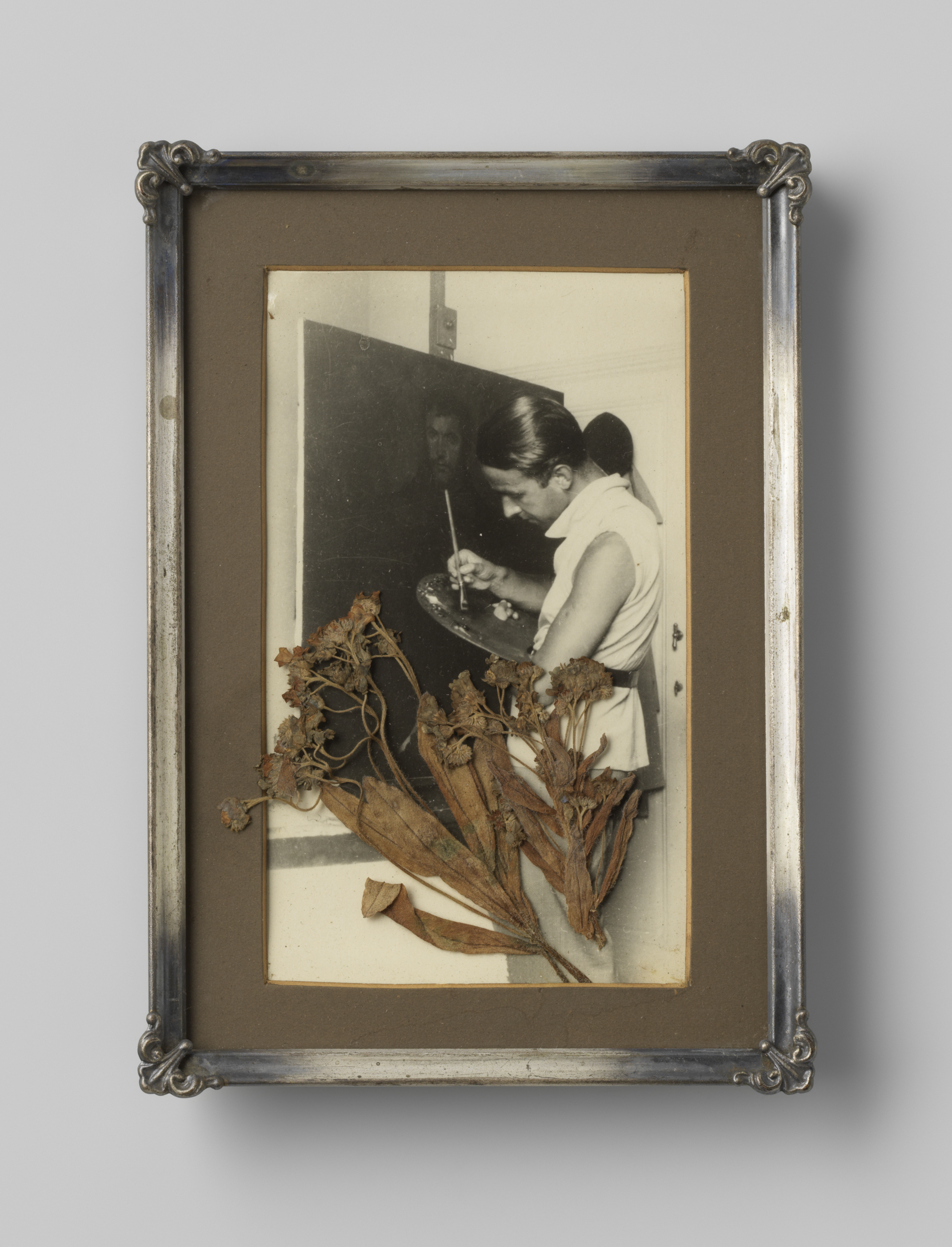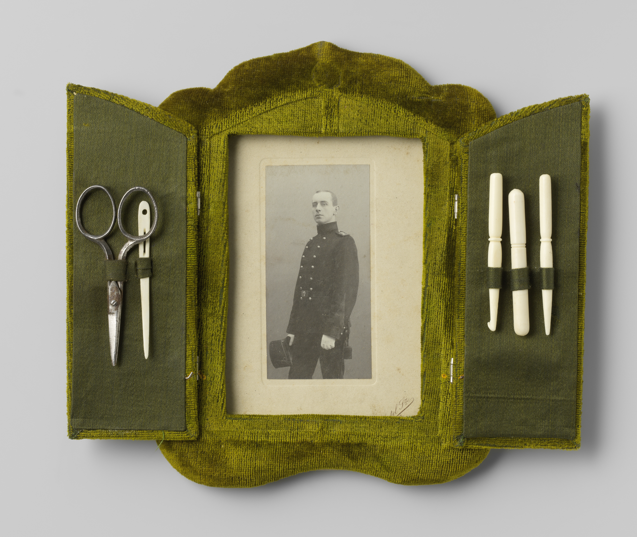 Naaigarnituur met schaar, naaigerei en een portret v...