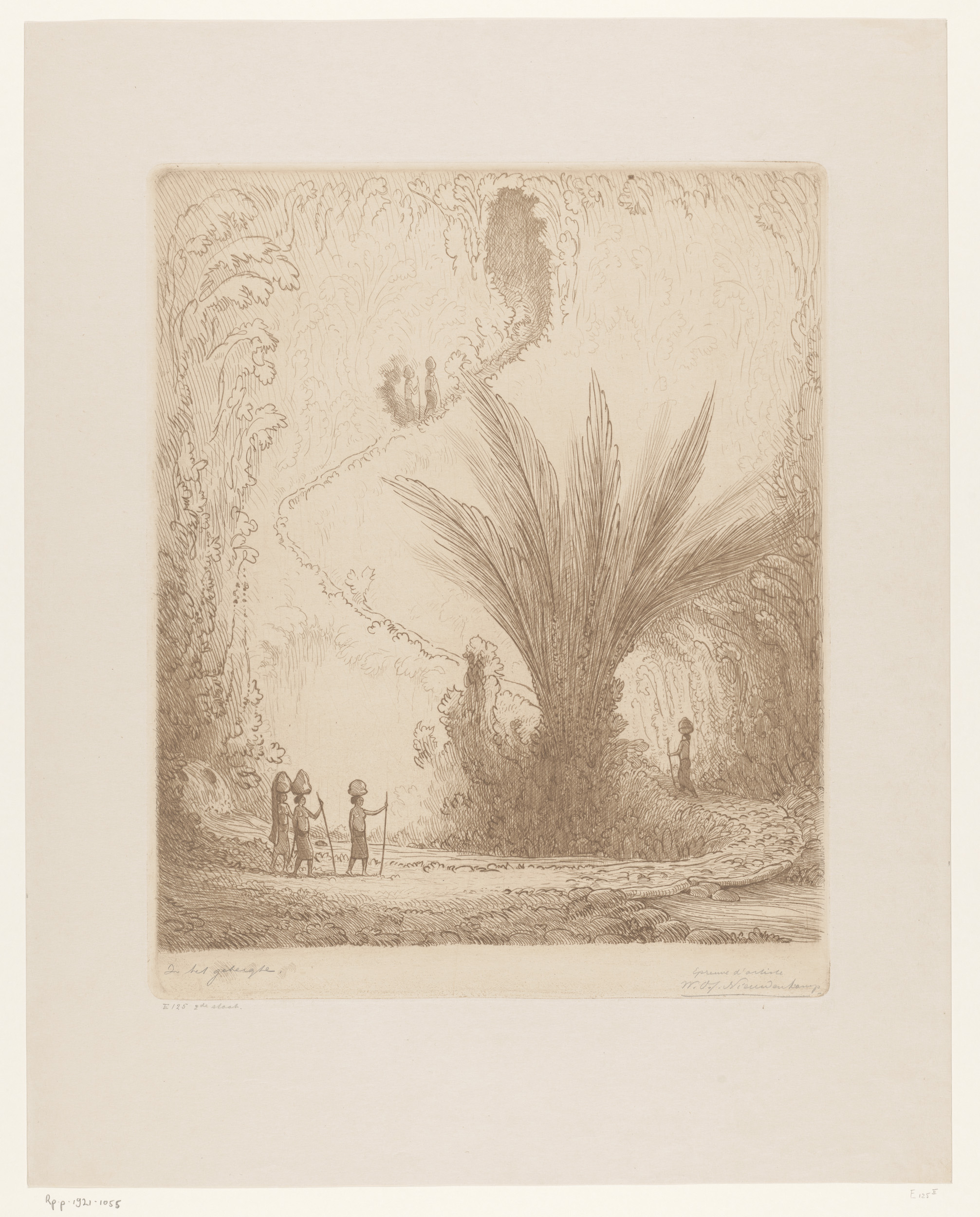 Figuren en een palmboom aan een oever in Batavia