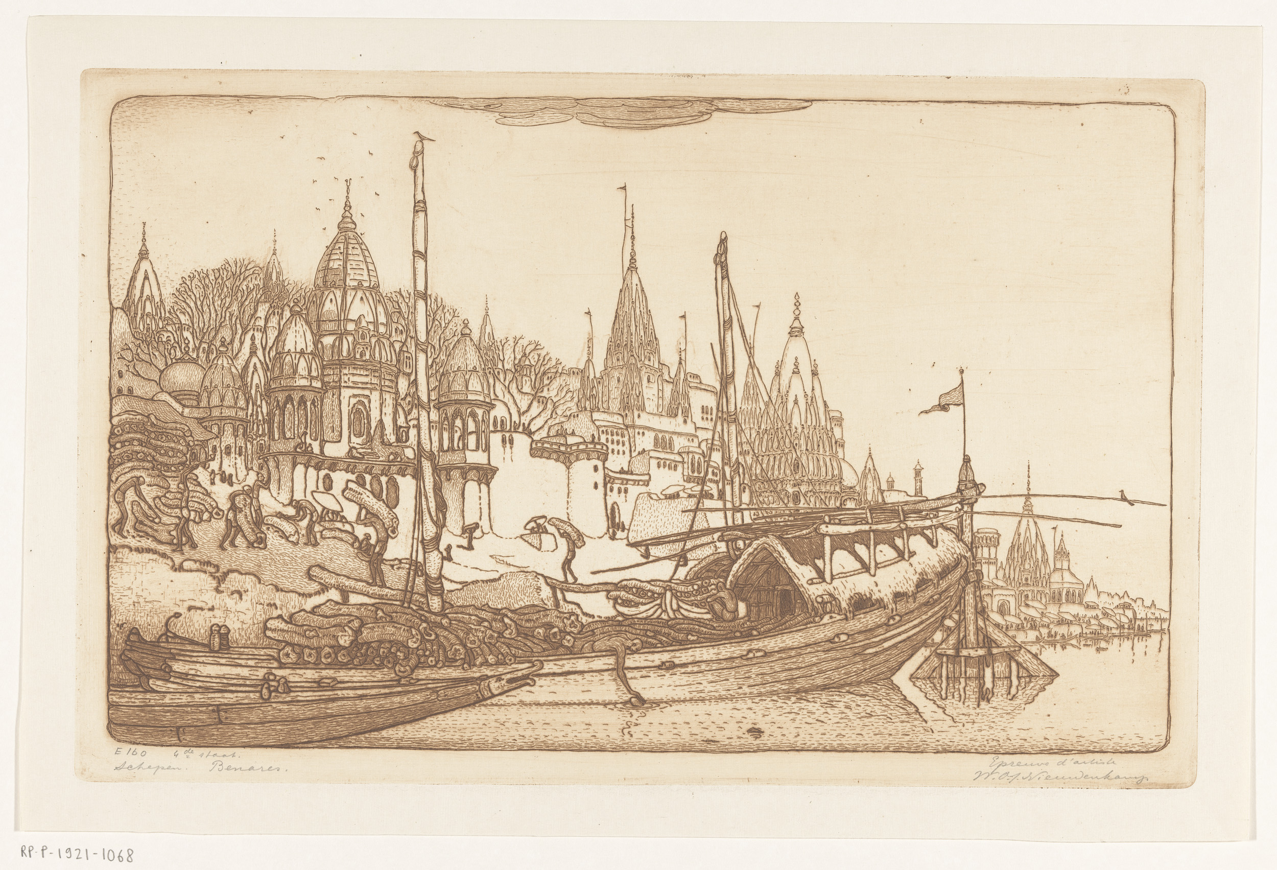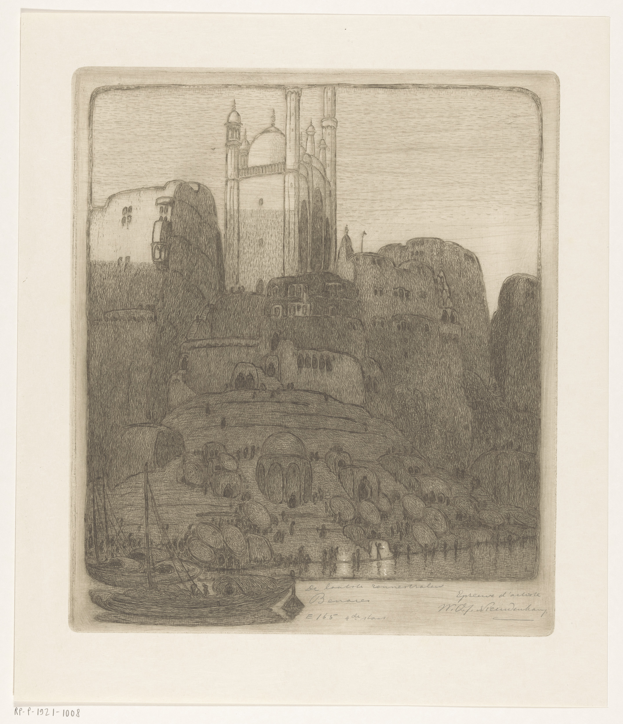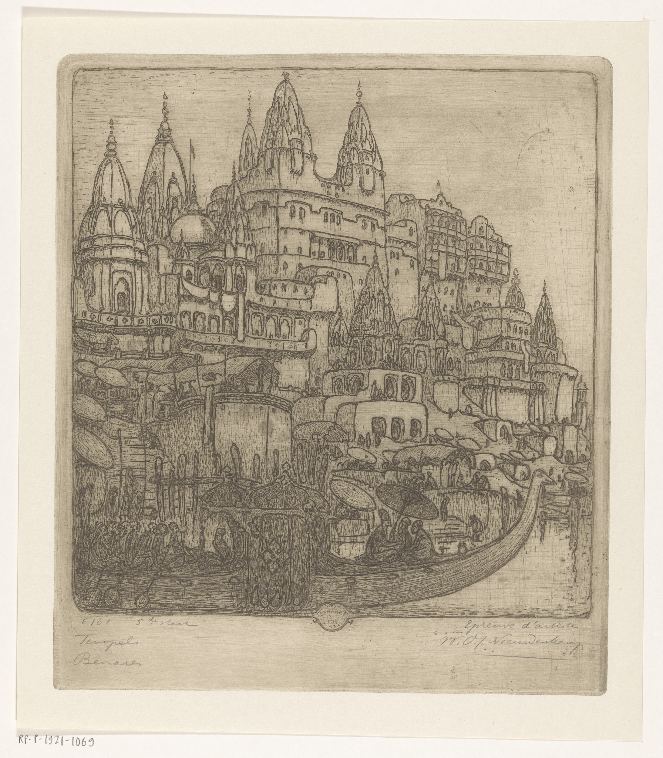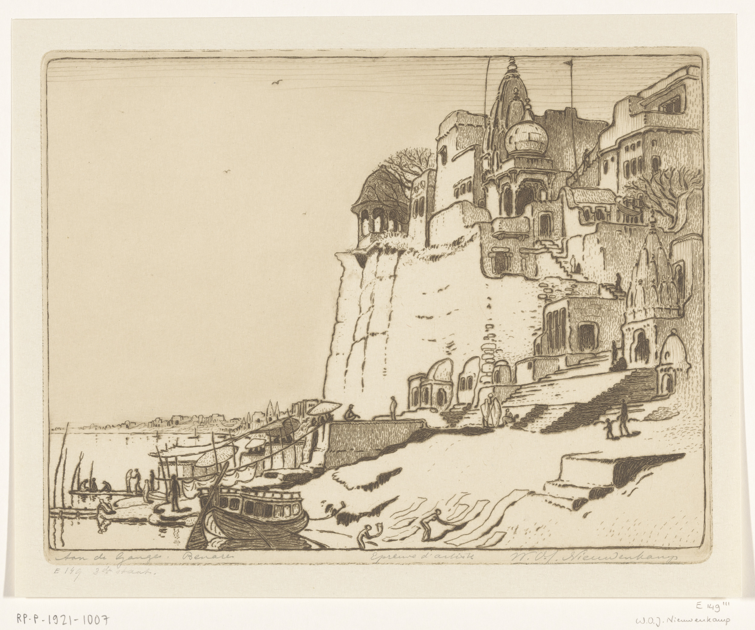 Woningen en tempels aan de Ganges in Benares