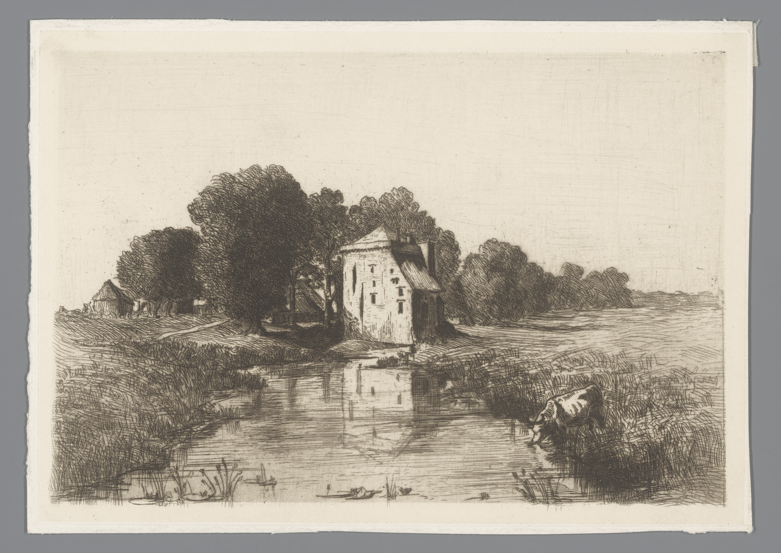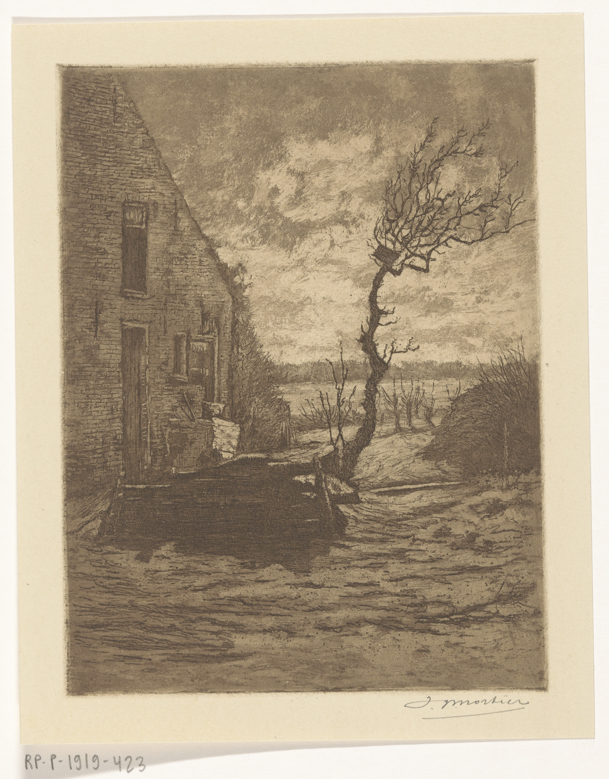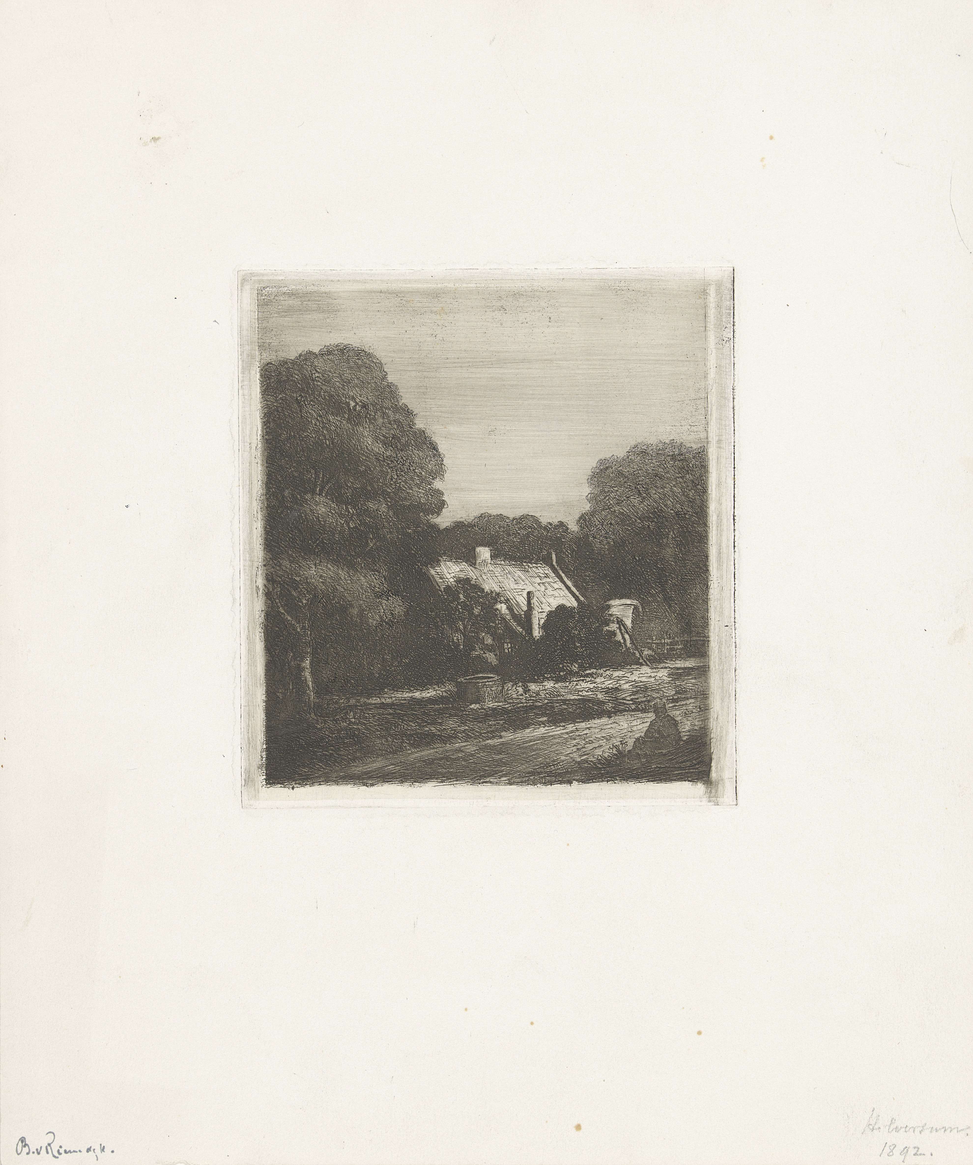 Boerderij in een landschap met een kale boom