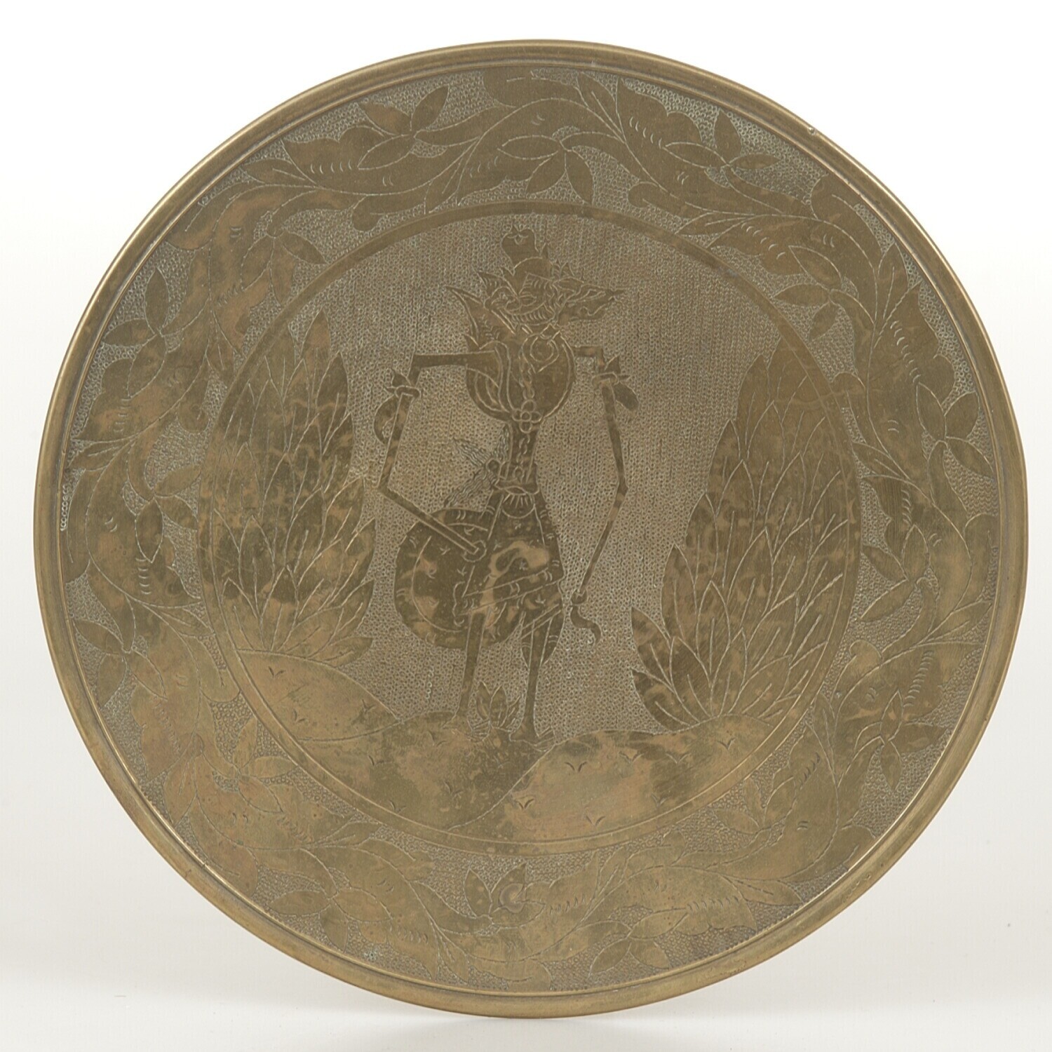 Rond messing bord met wajangfiguur Batara Kreshna vo...