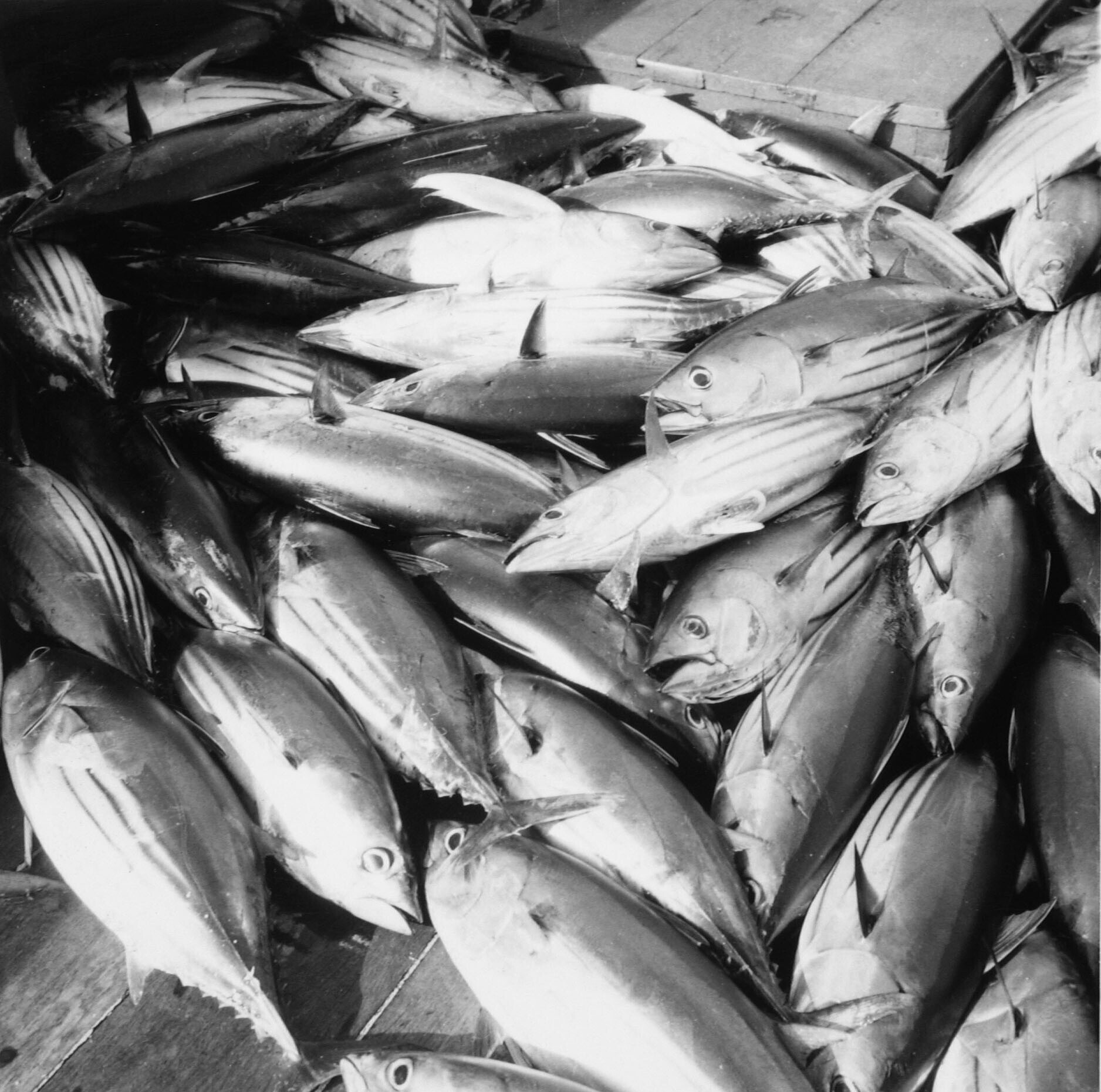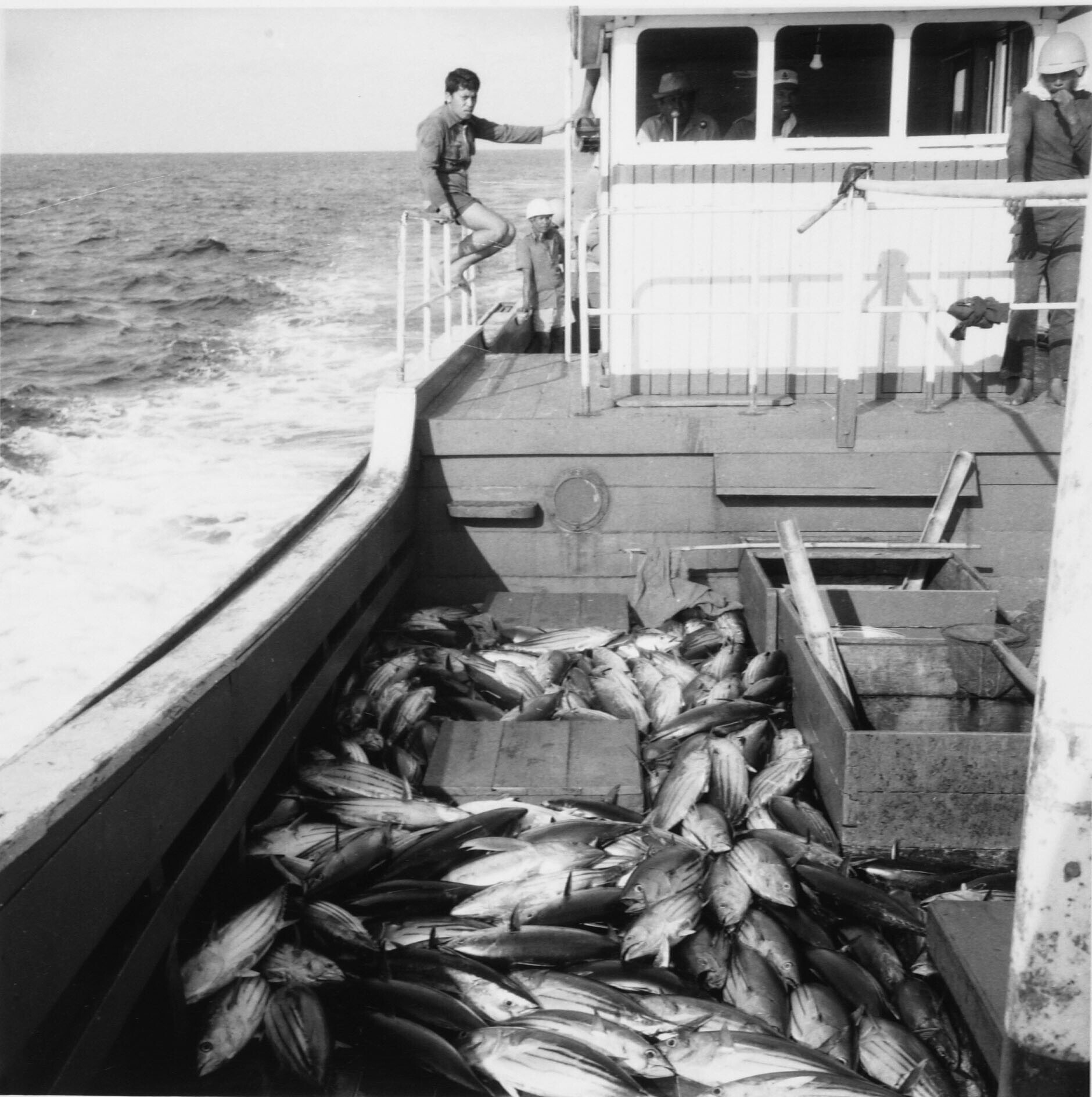 De gevangen tonijn wordt va de tonijnvisser in prauw...