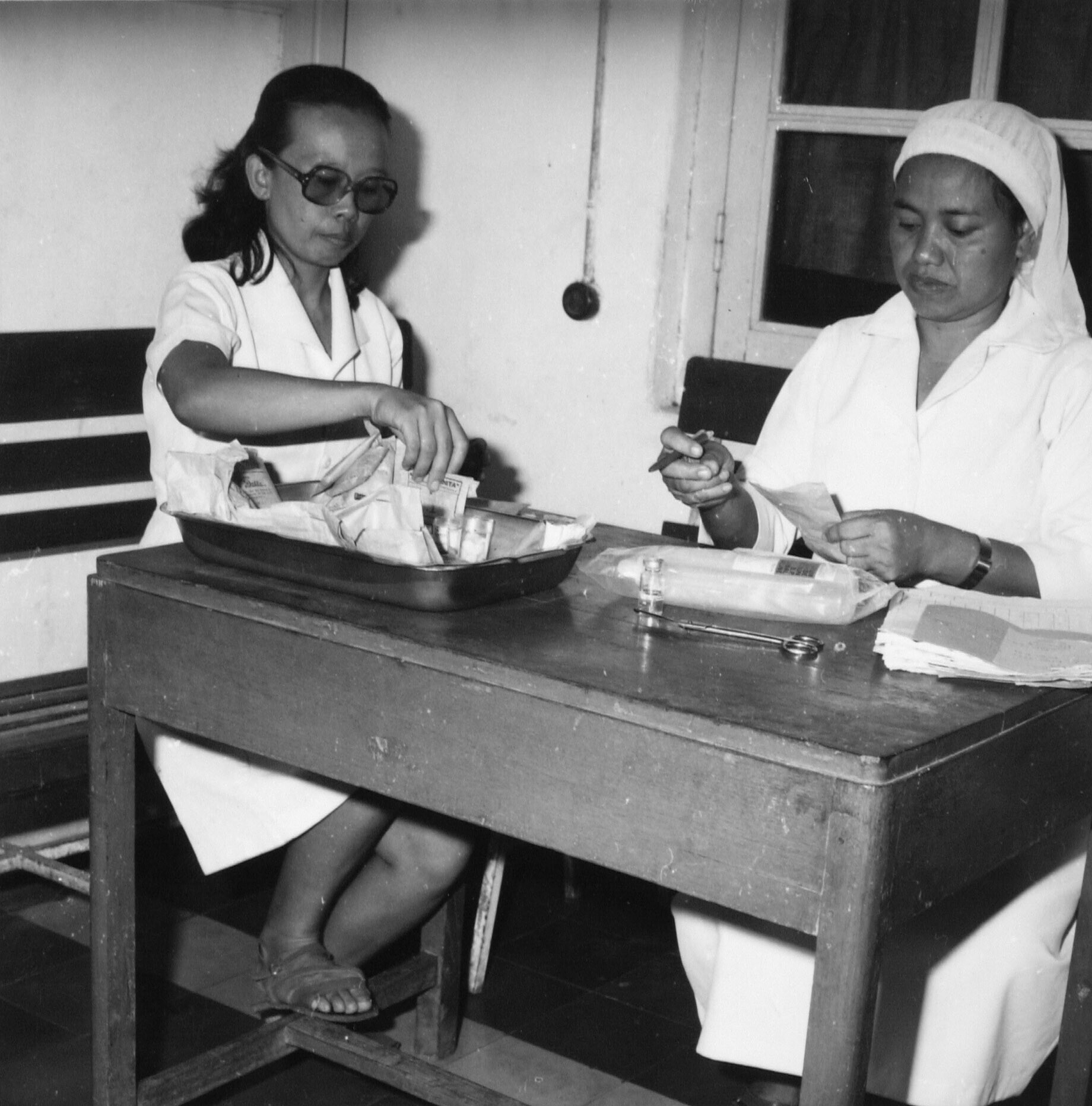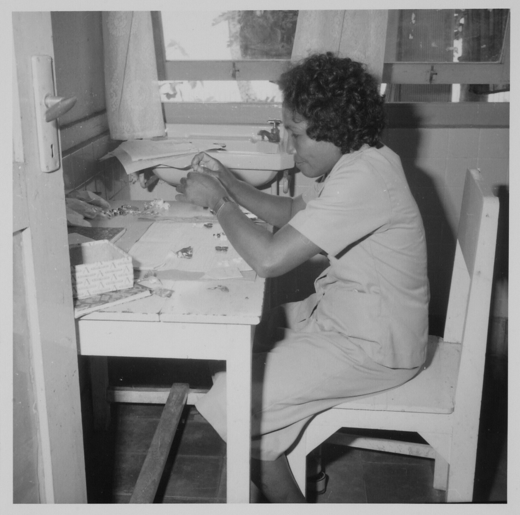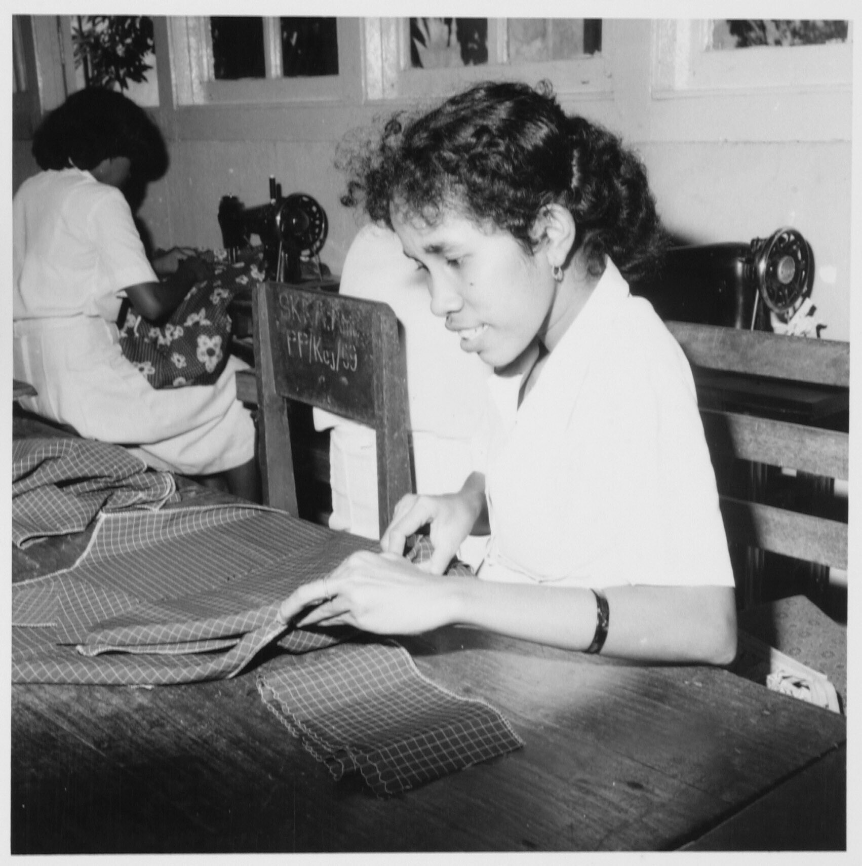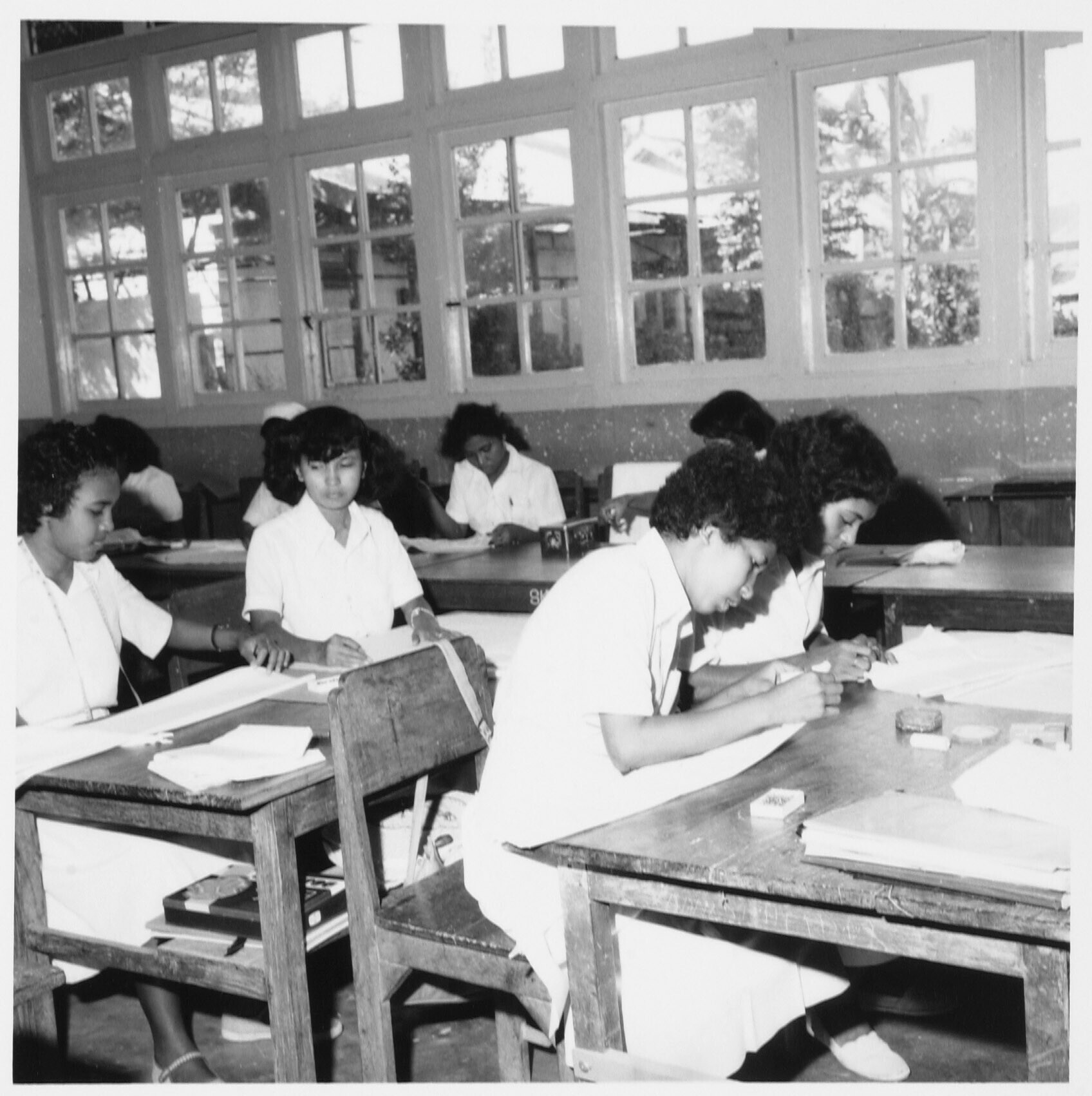 Meisjes van de huishoudschool tijdens het patroonmaken
