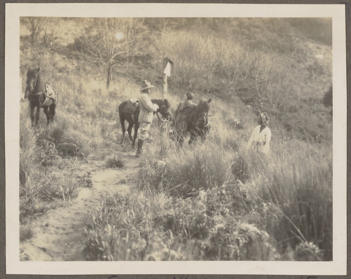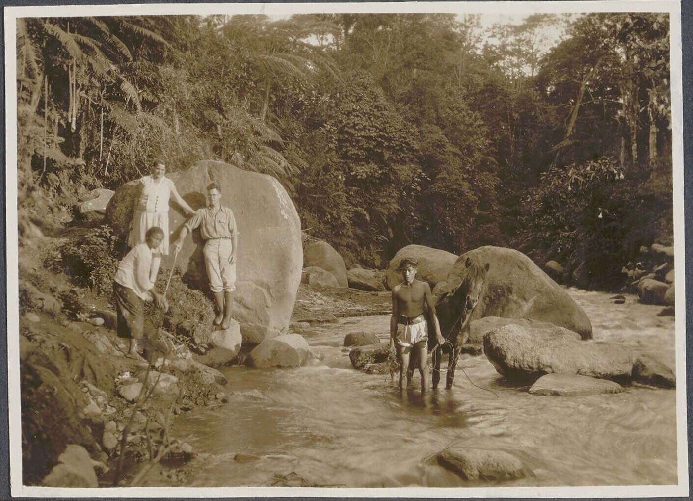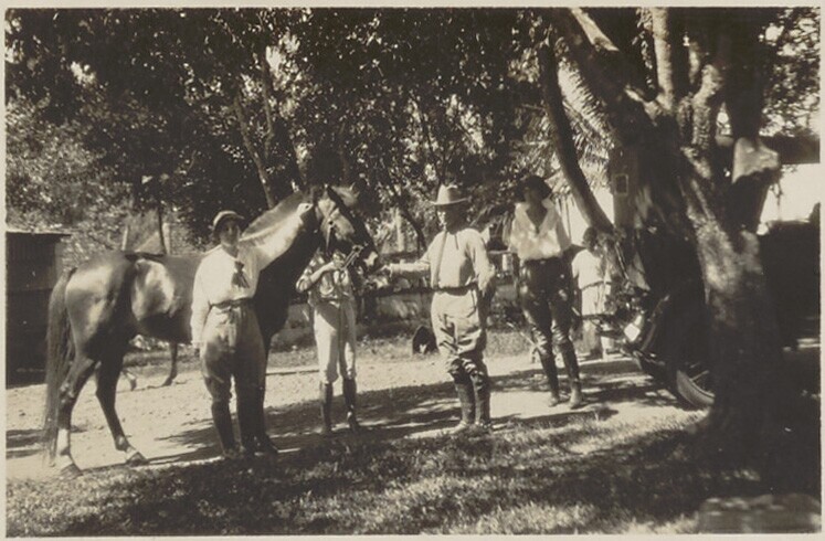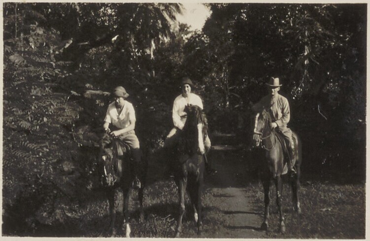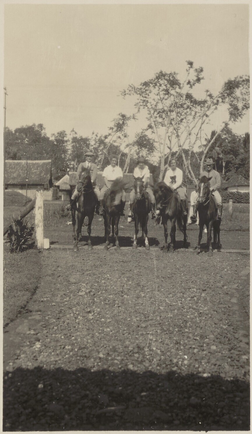 Drie Europese vrouwen en twee mannen te paard
