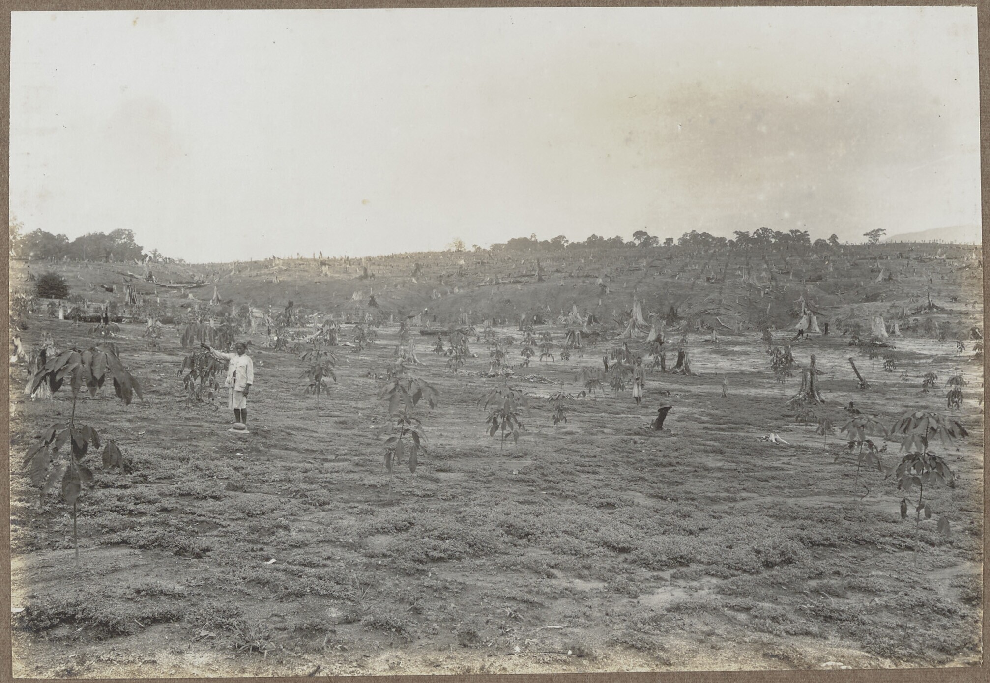 Jonge rubberbomen op ontgonnen terrein van de koffie...