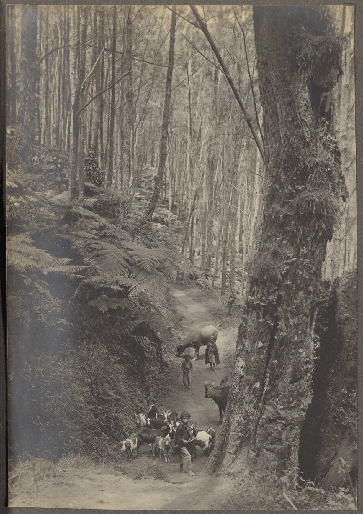 Drie kinderen lopen met hun vee over een bospad