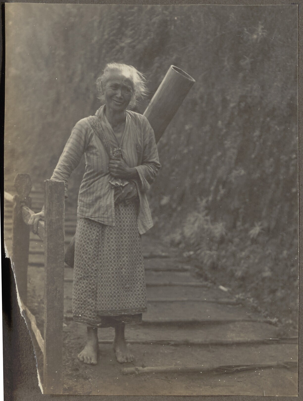Portret van een oudere vrouw met een houder op haar rug