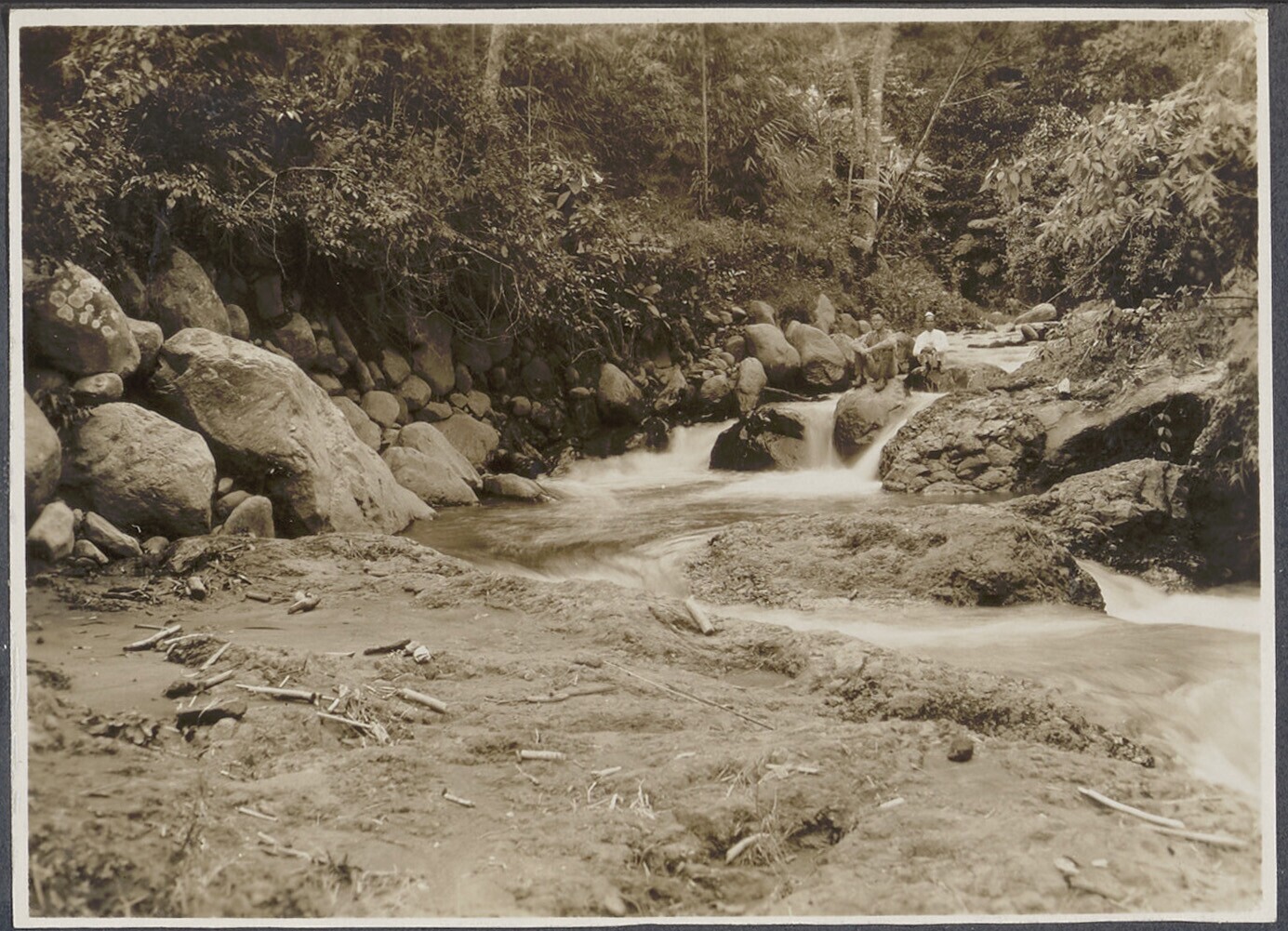 Twee mannen zitten op een rots in een beek nabij Non...