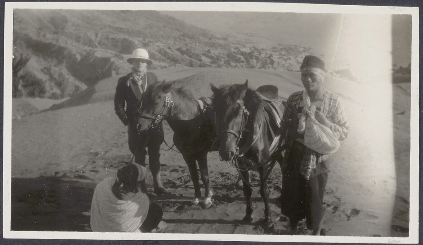 Toerist poseert naast twee paarden en gidsen op een ...