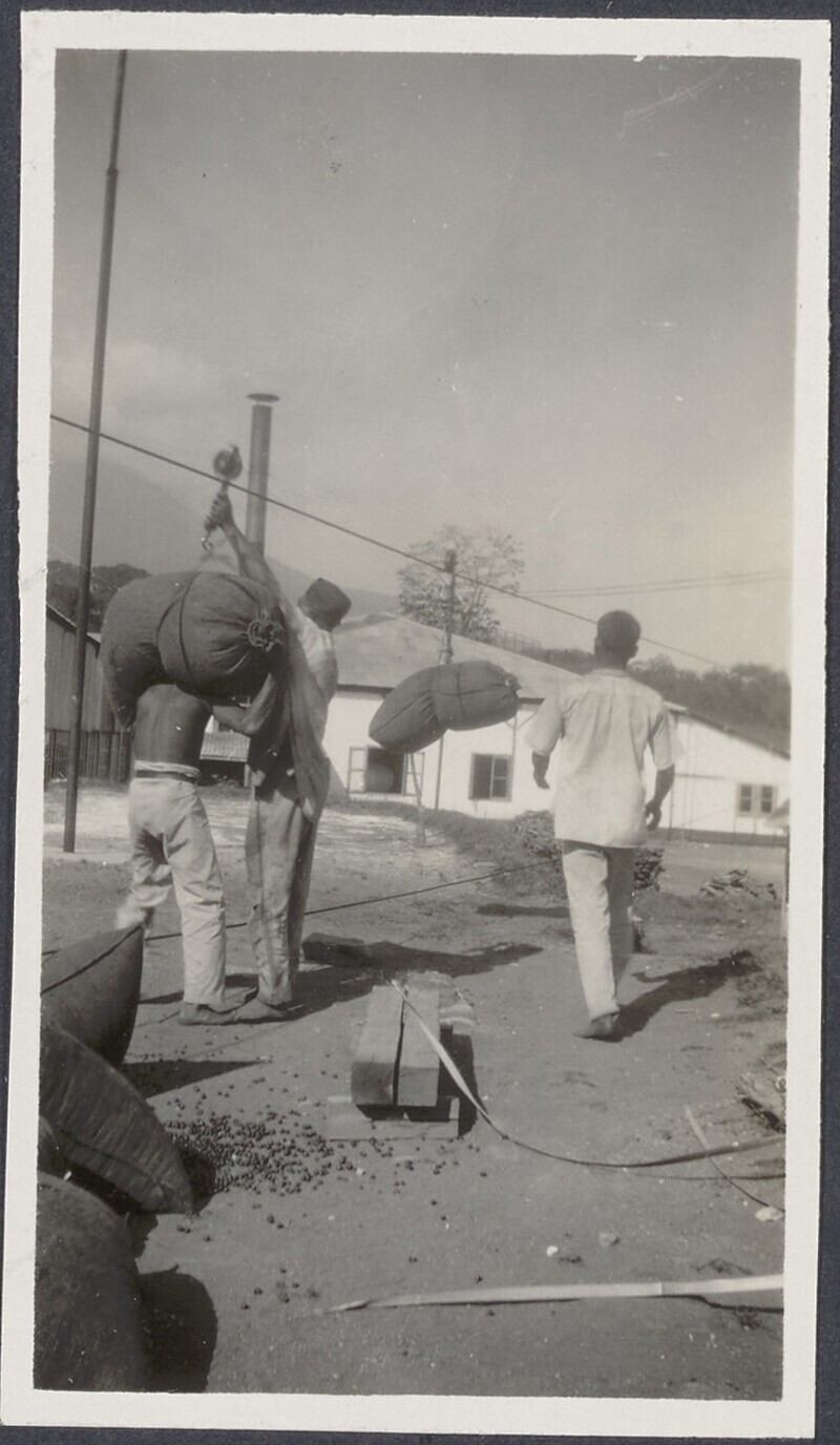 Mannen hangen de koffiebalen aan een transportkabel