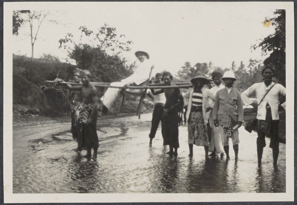 Toerist wordt in een draagstoel de beek overgedragen