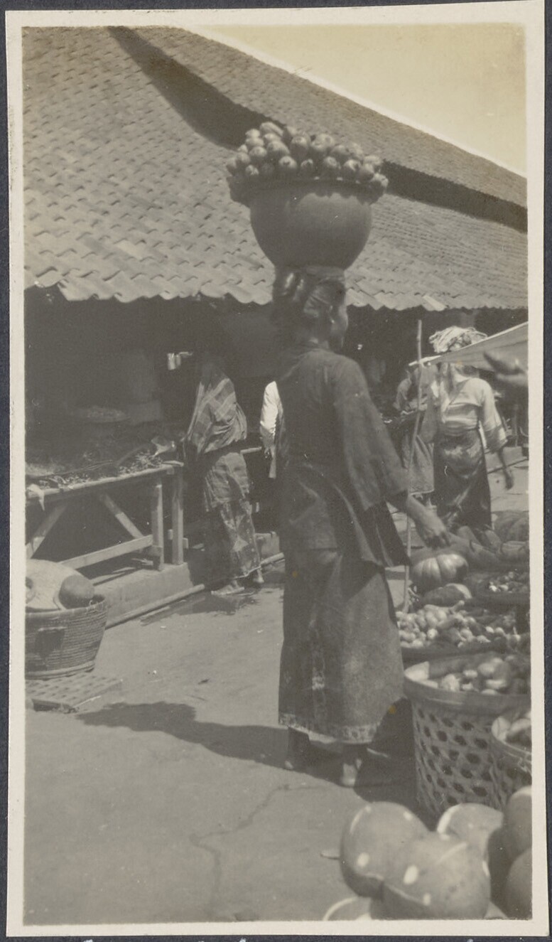 Marktkoopvrouw met maiskolven op haar hoofd
