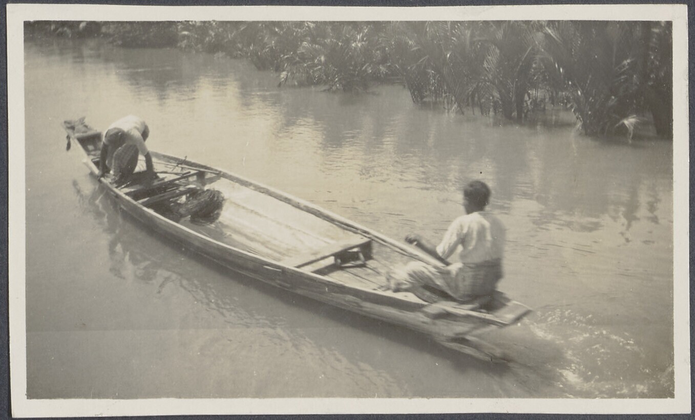 Twee mannen in een gemotoriseerde prauw