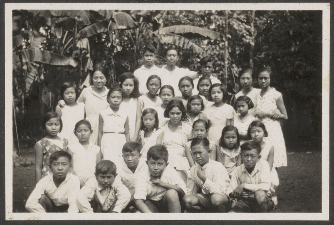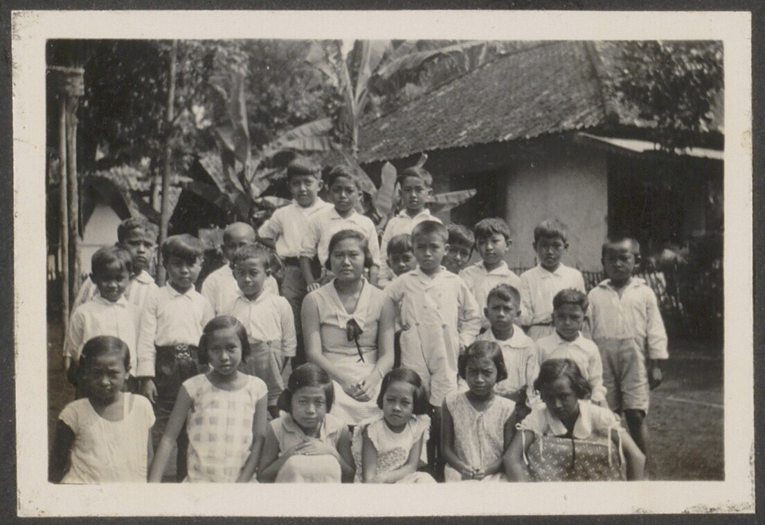 Javaanse kinderen met Javaanse leraar in tuin. Klass...