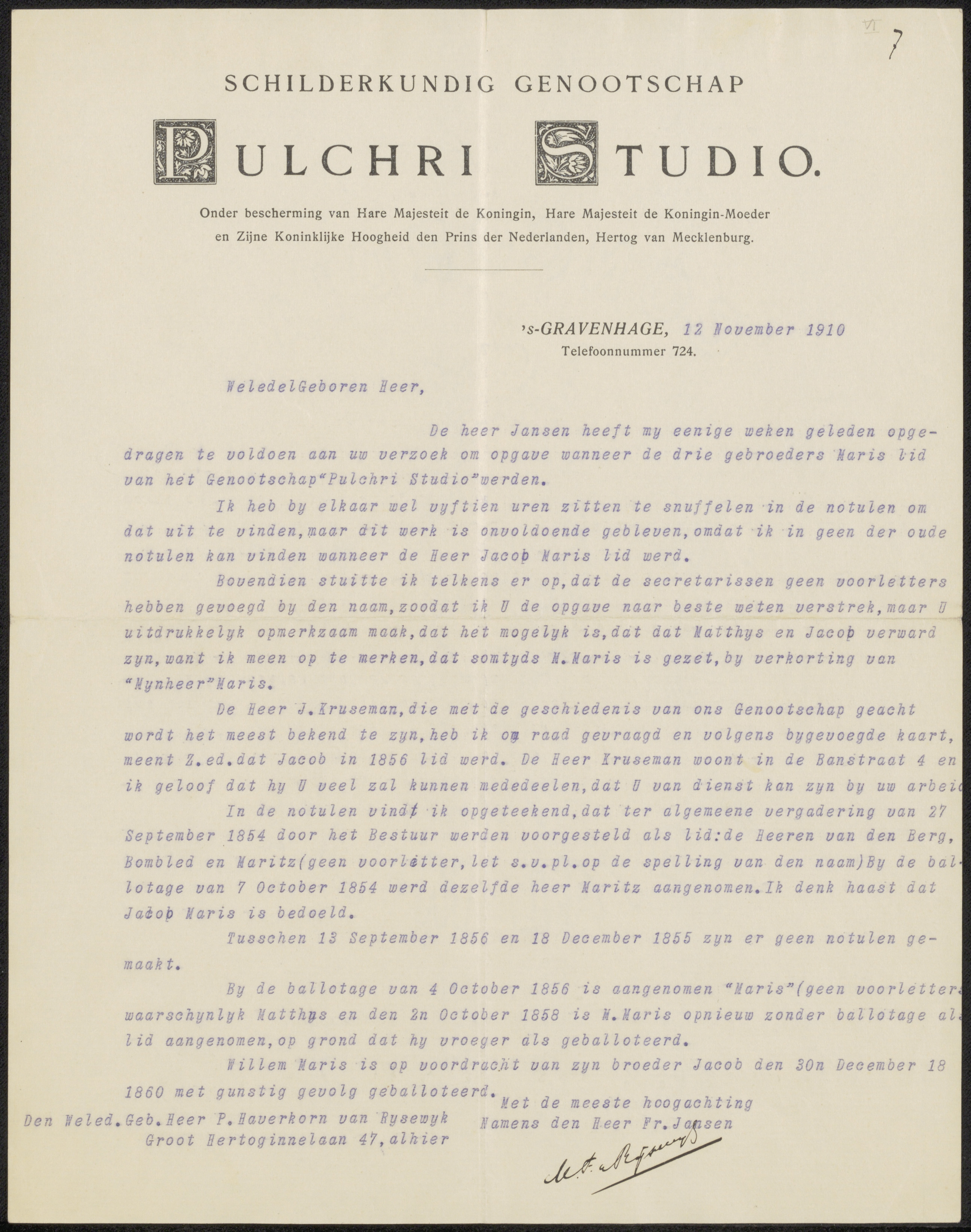 Brief aan Pieter Haverkorn van Rijsewijk