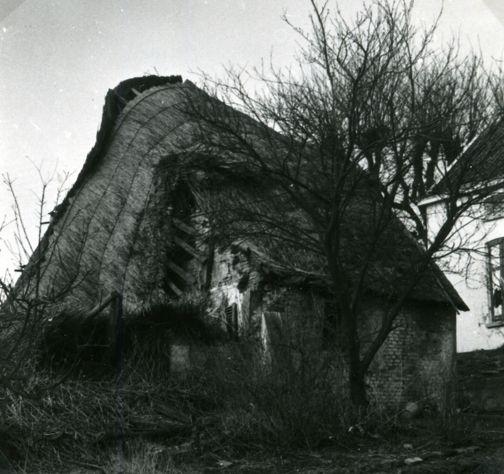 Zwart-wit foto van het schuurtje bij boerderij aan d...