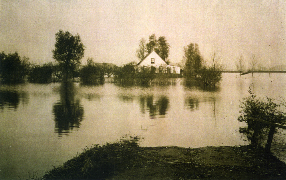 Zwart-wit foto bij hoogwater van de boerderij van de...