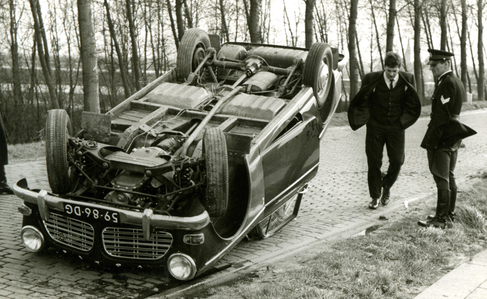 Zwart-wit foto van een gekantelde auto bij de afrit ...