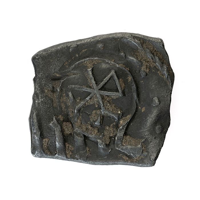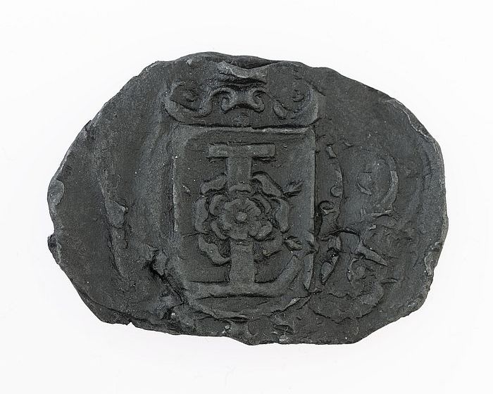 Dakloodje, schildvormig afdekplaatje met "1637", ini...