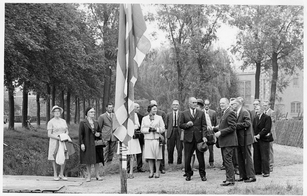 Groep personen gaat de vlag hijsen ter gelegenheid v...