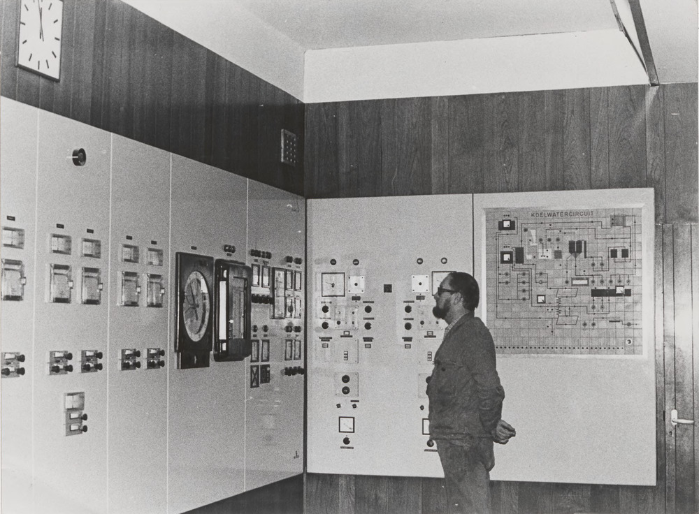 Op de foto een man die de tekening van een koelwater...
