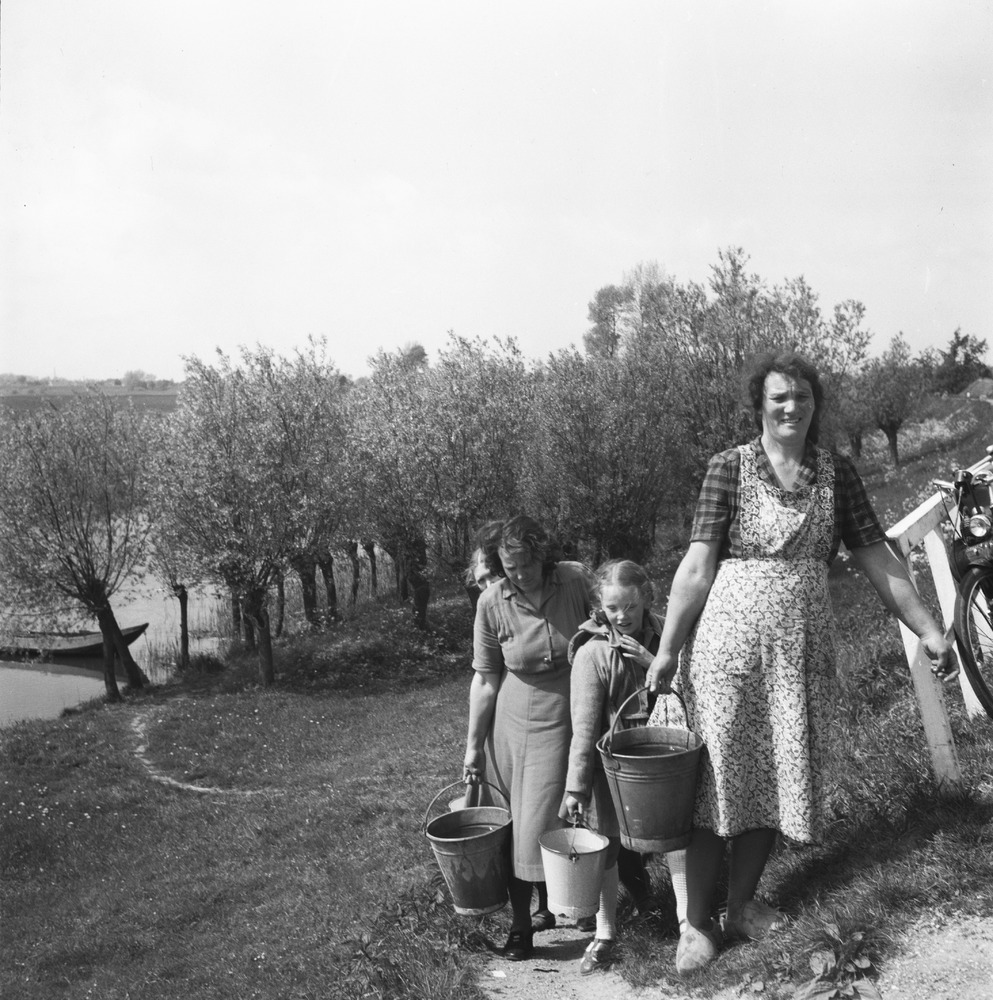 Bewoners aan de dijk halen water in de Afgedamde Maas