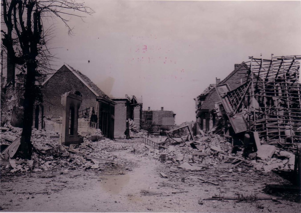 Verwoeste huizen aan de voorstraat te Ammerzoden.