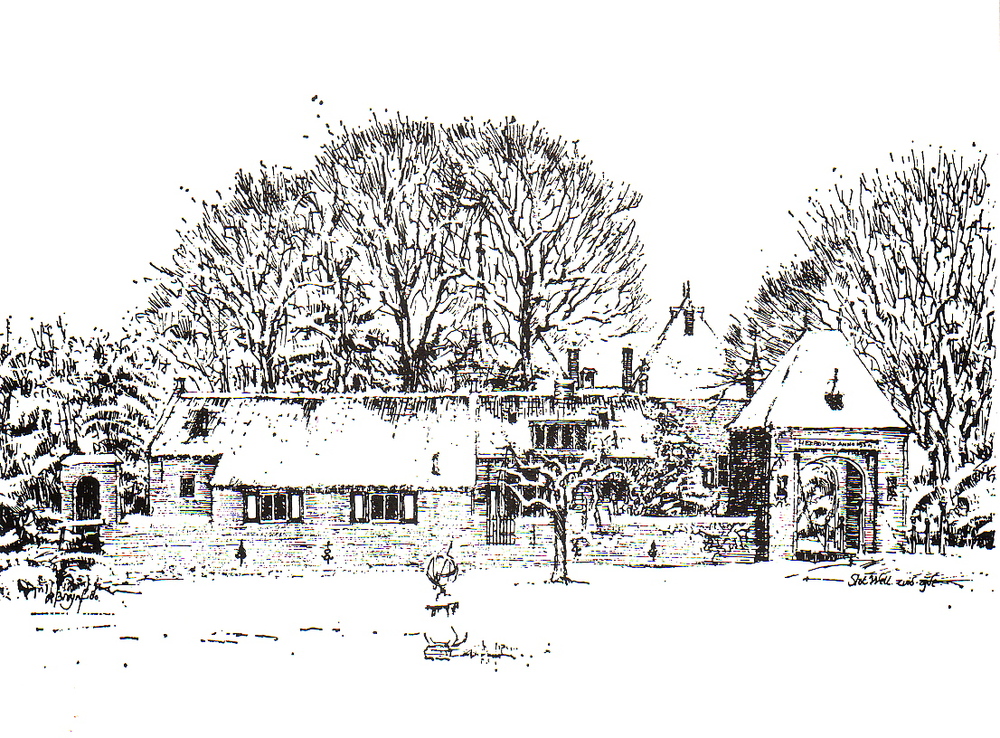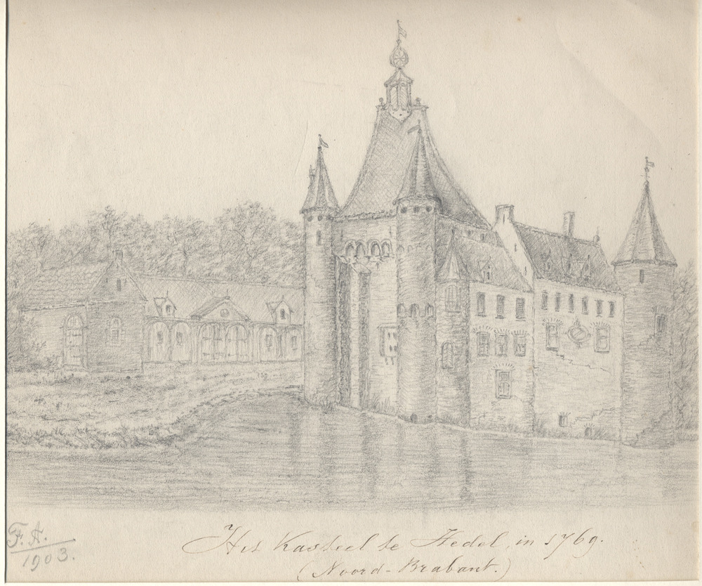 Gezicht op kasteel Hedel met slotgracht en bijgebouw...