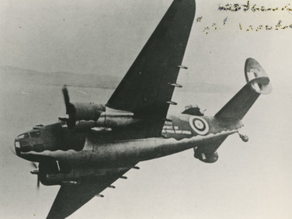 Foto van een vliegende Lockheed Hudson. Tekst achter...