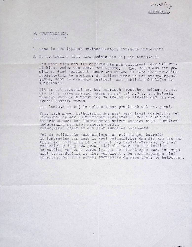 Getypte doorslag van bericht over de cultuurkamer .
