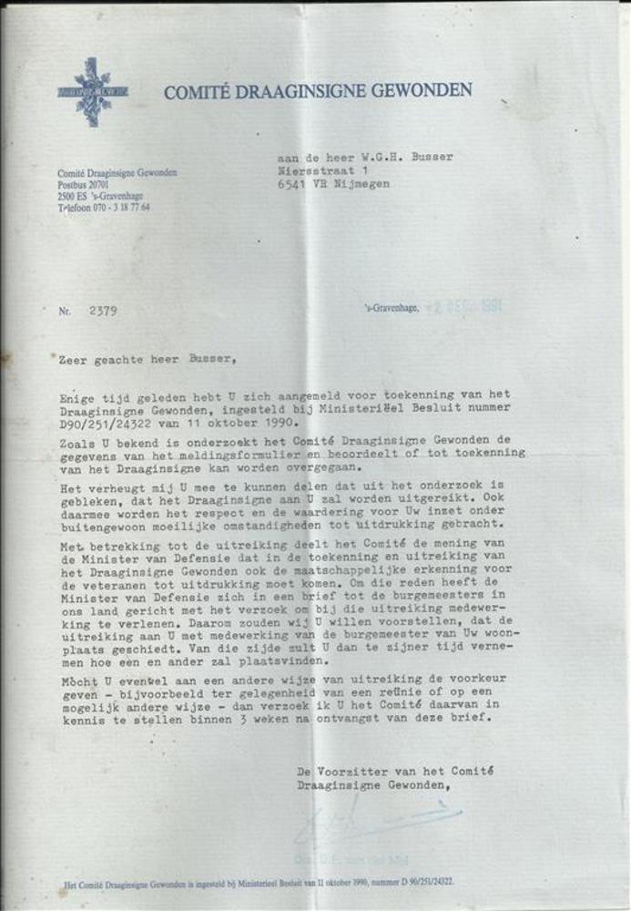 Comité Draaginsigne Gewonden - aan dhr Busser