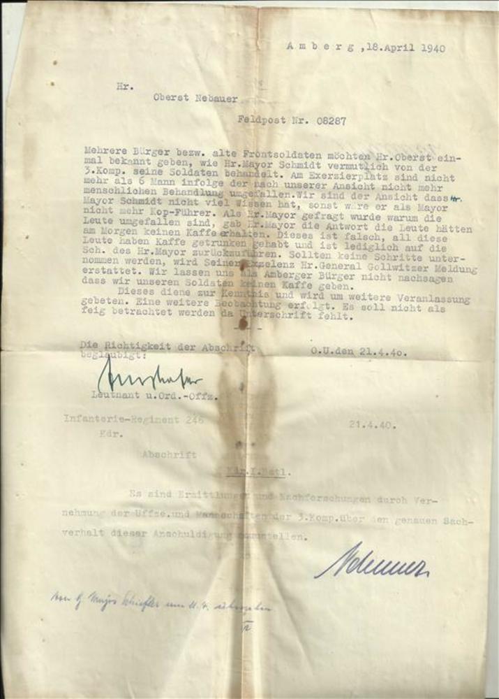 Brief aan Oberst Nebauer, Feldpost nr.08287, Amberg ...