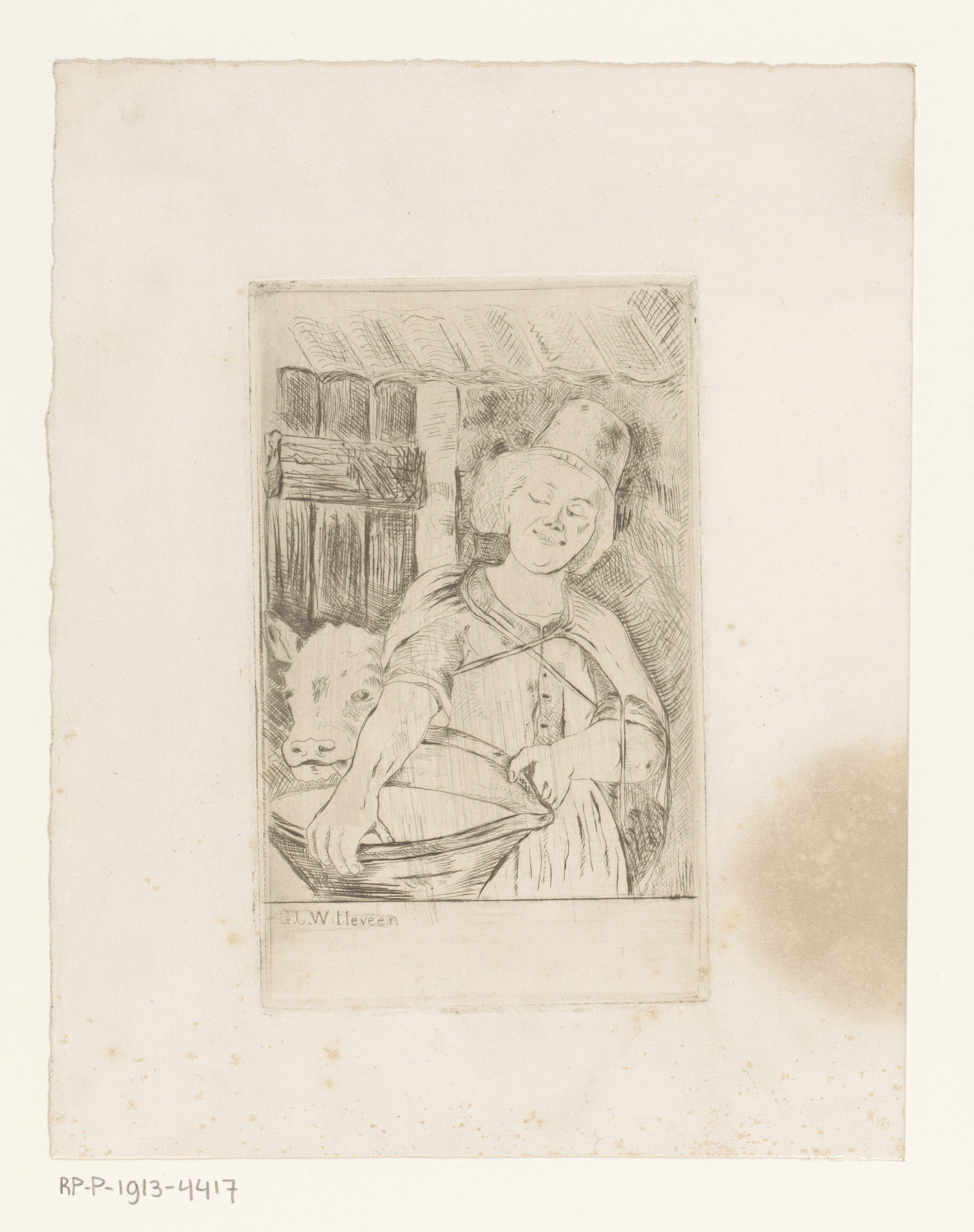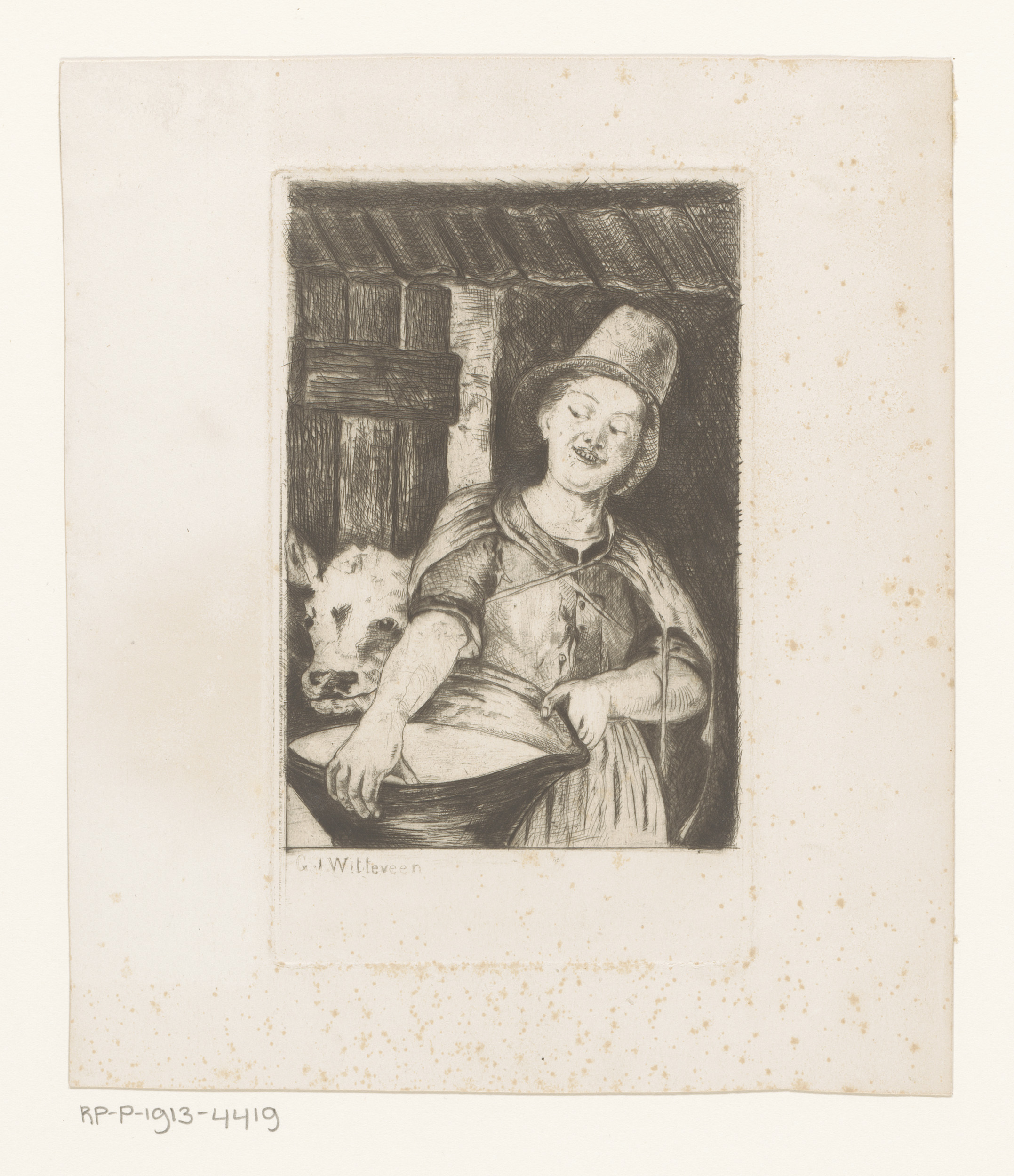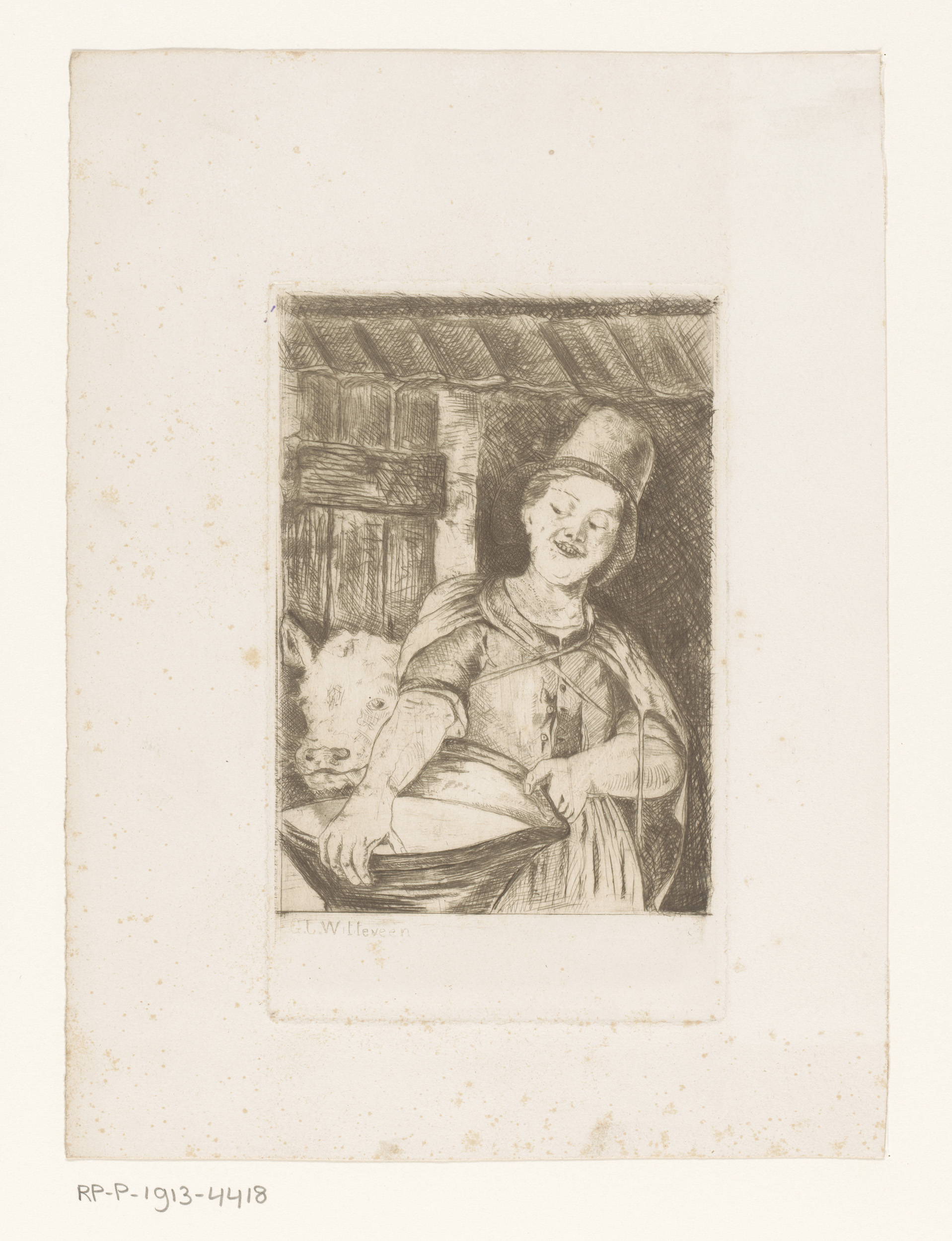 Melkmeisje in koeienstal