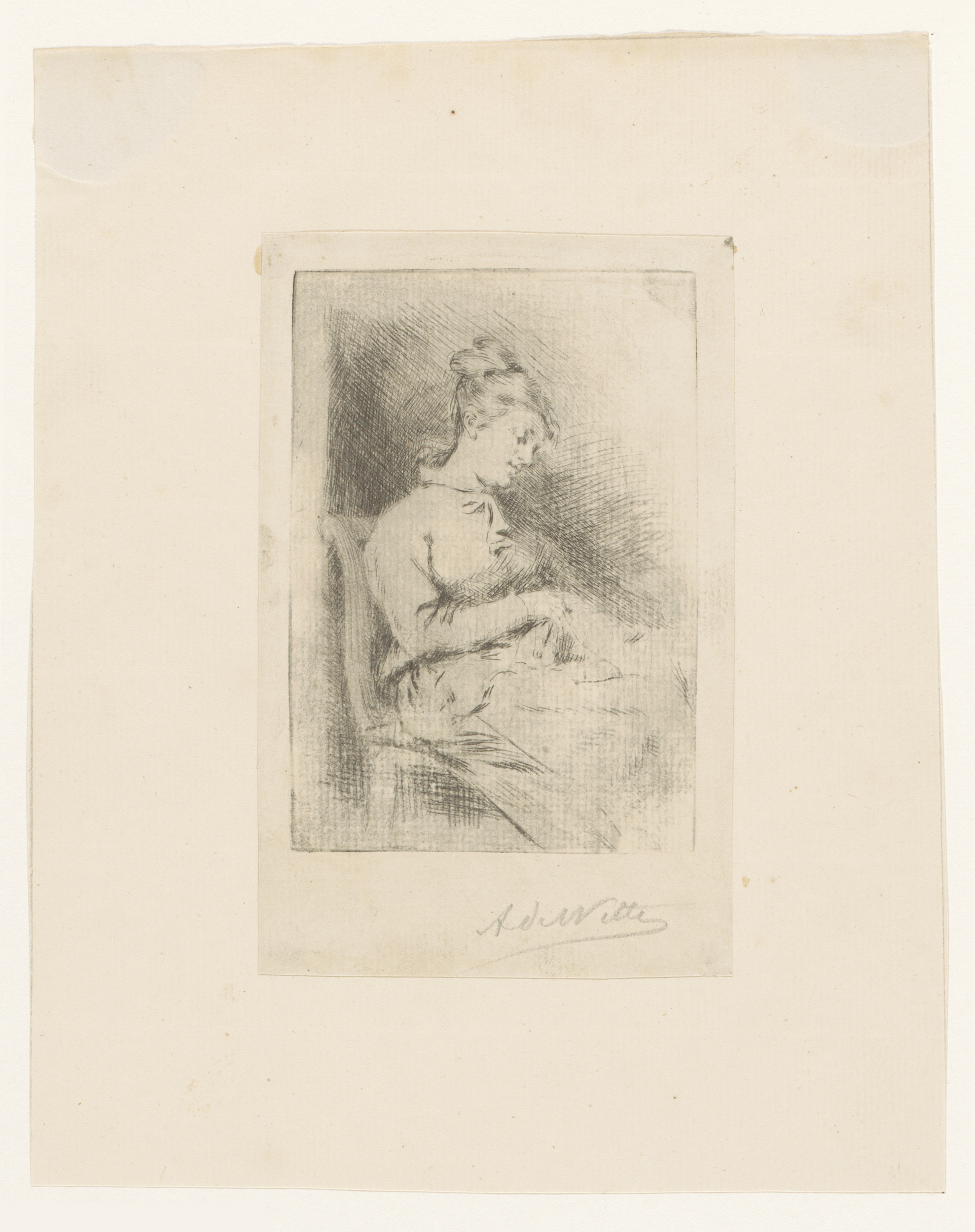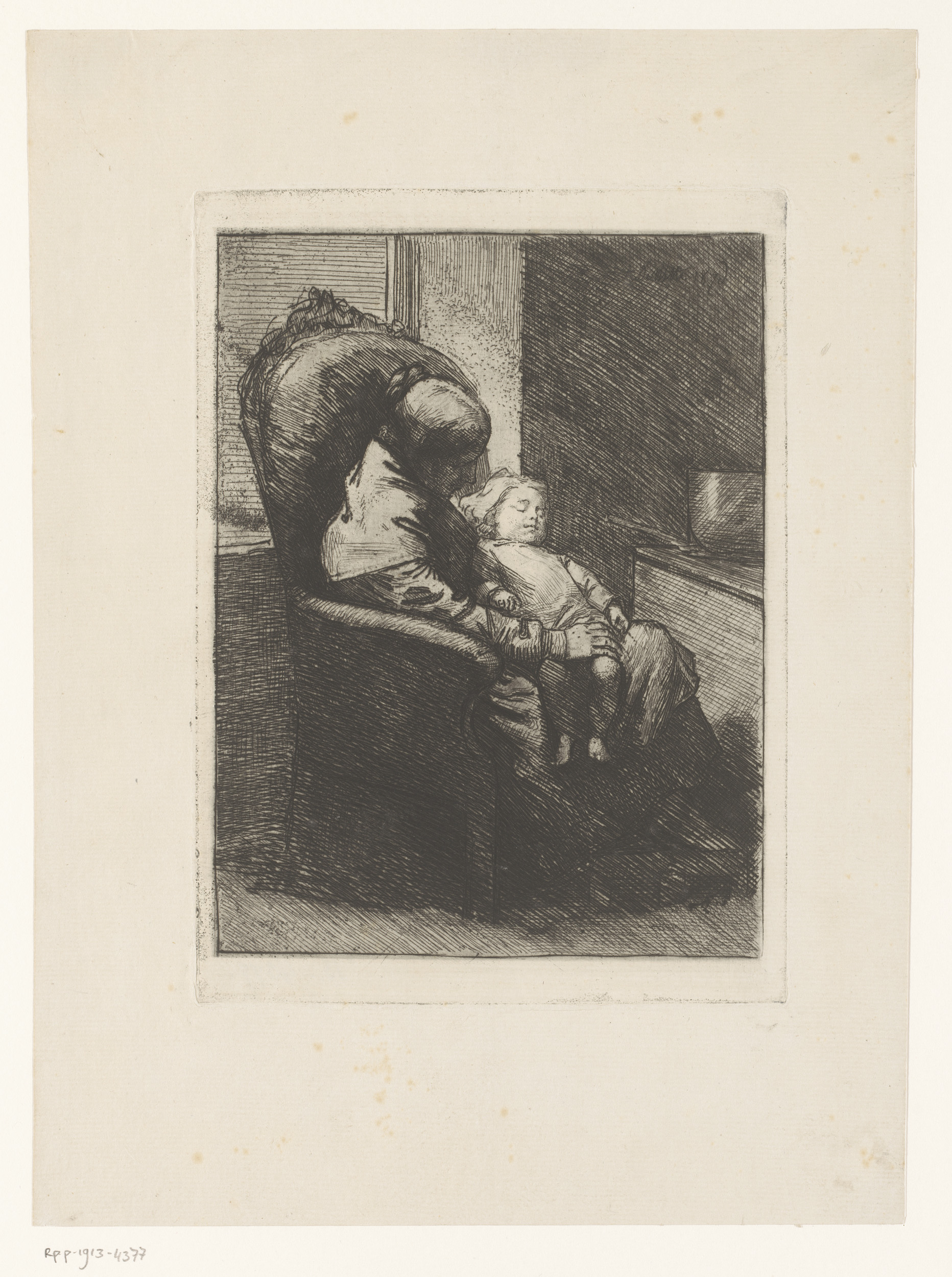 Moeder gezeten in een stoel met slapend kind op schoot