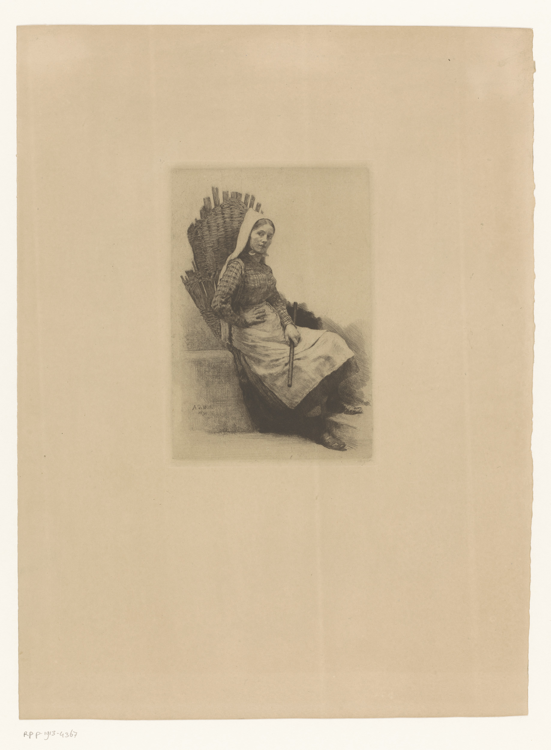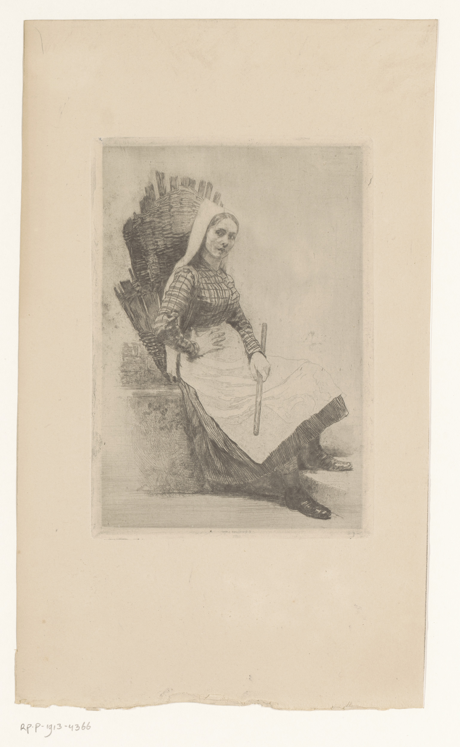 Vrouw met mand op haar rug en een stok in haar hand