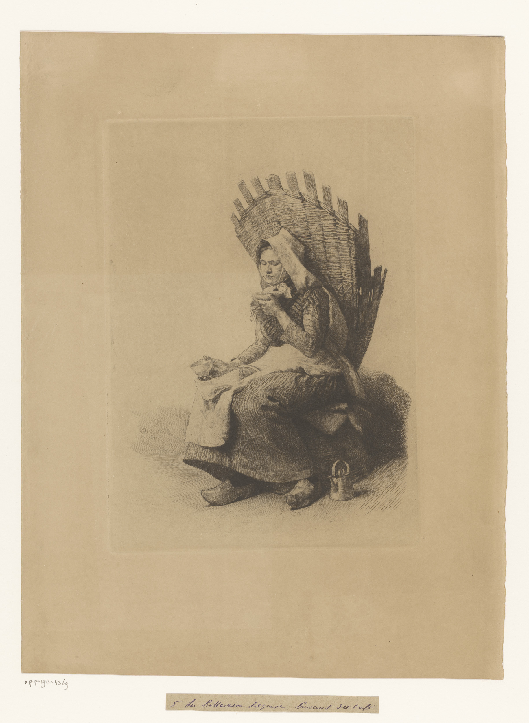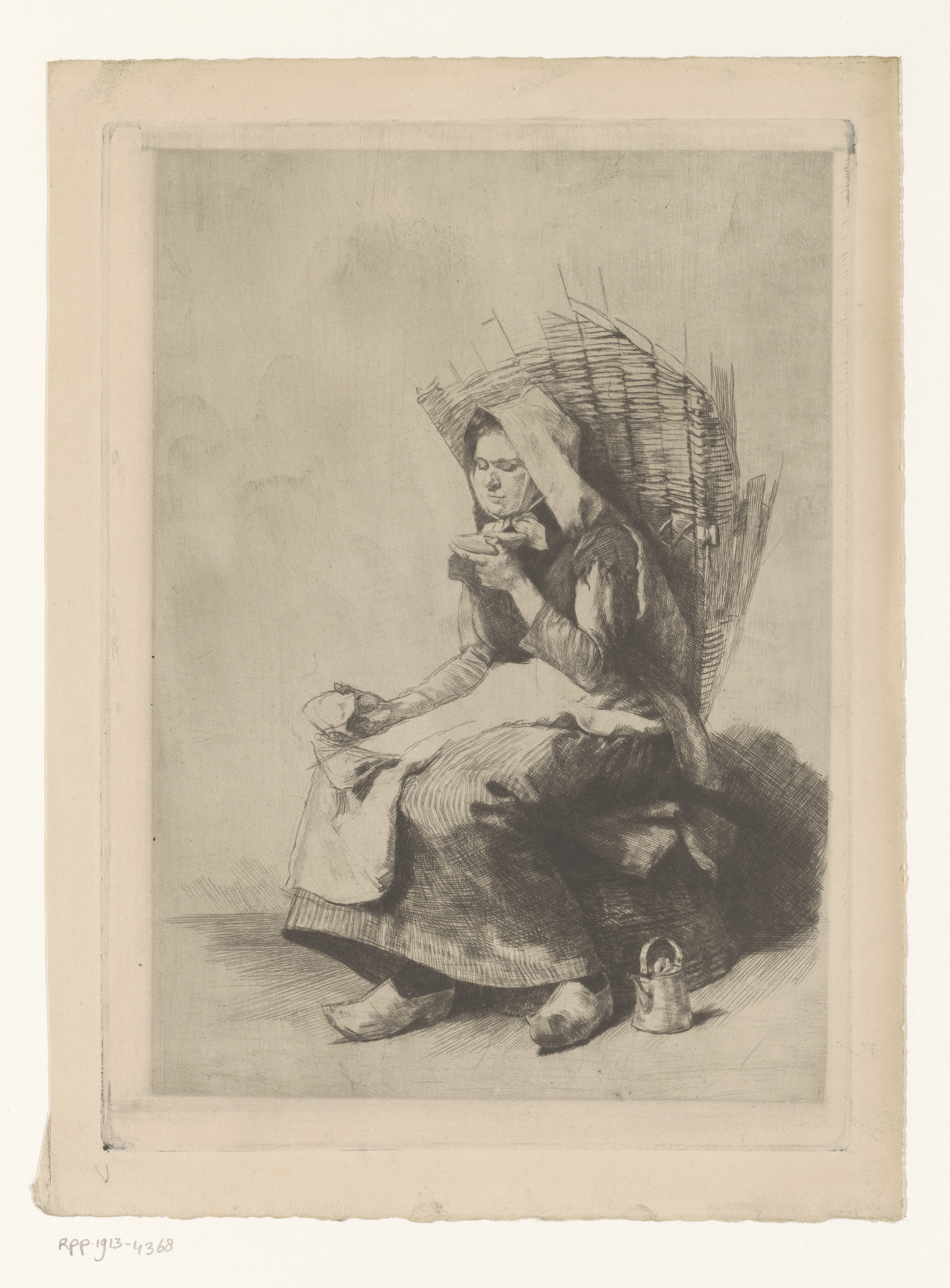 Vrouw met mand op haar rug blaast over een schotel