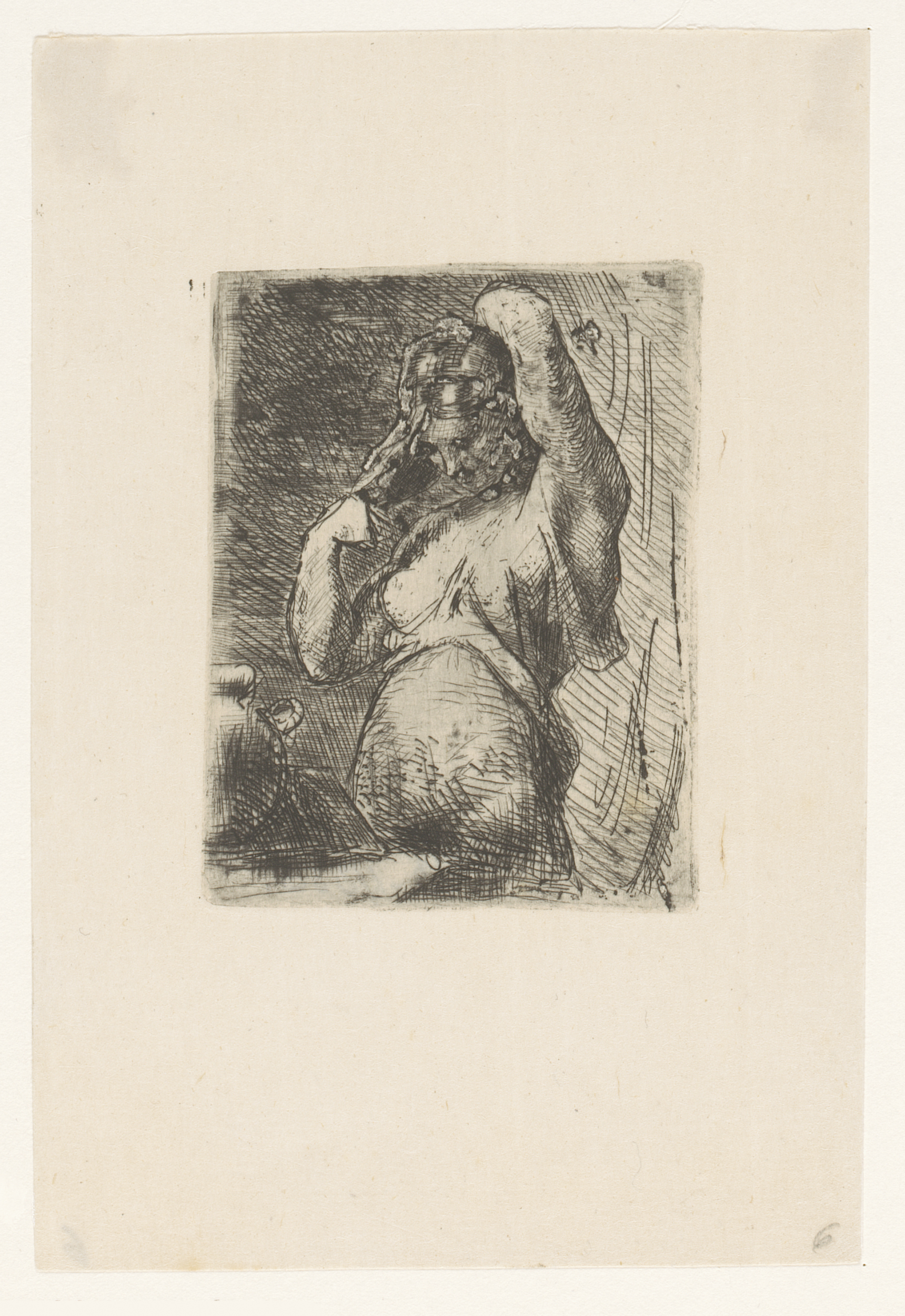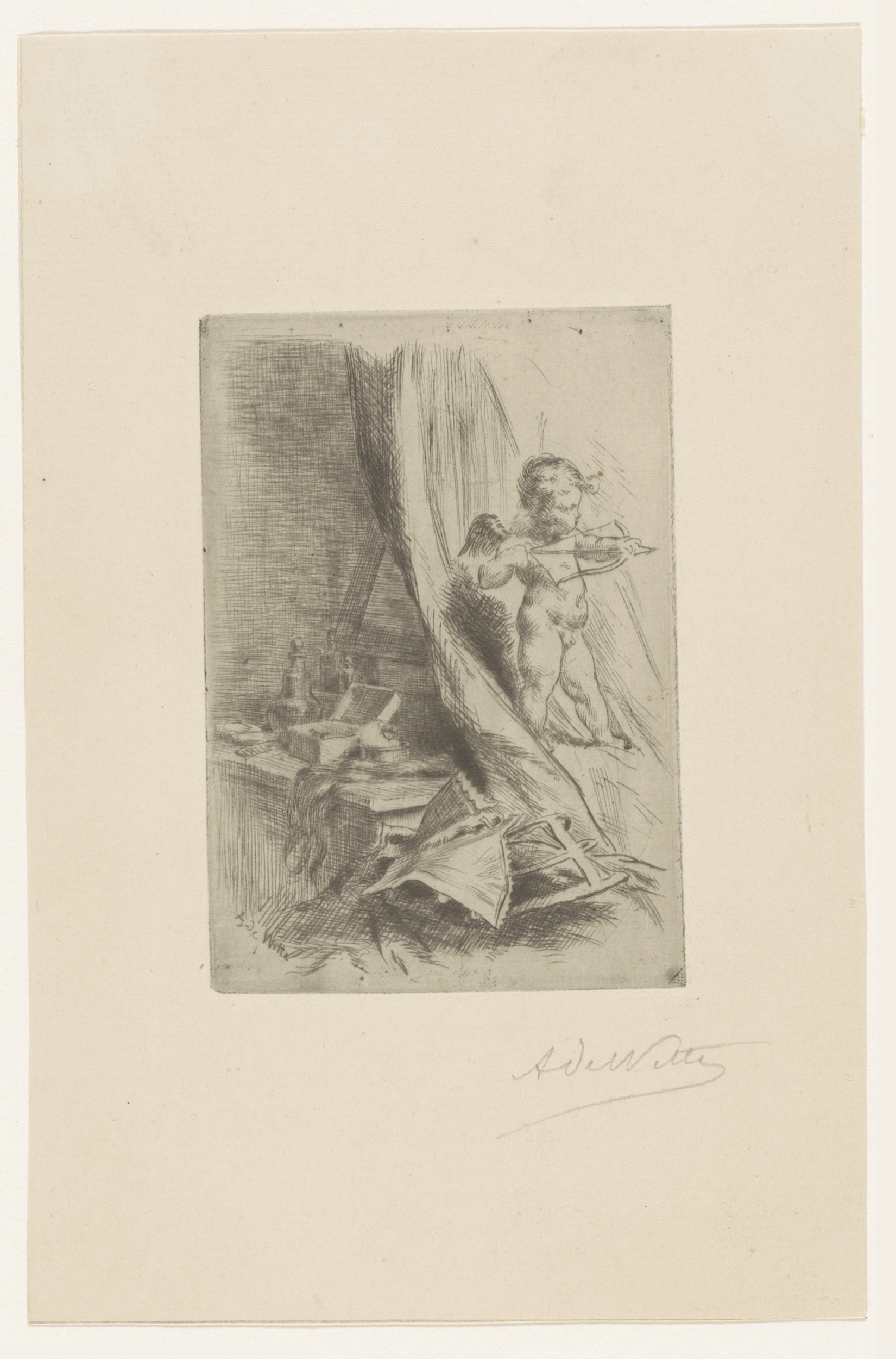 Cupido met pijl en boog bij een toilettafel