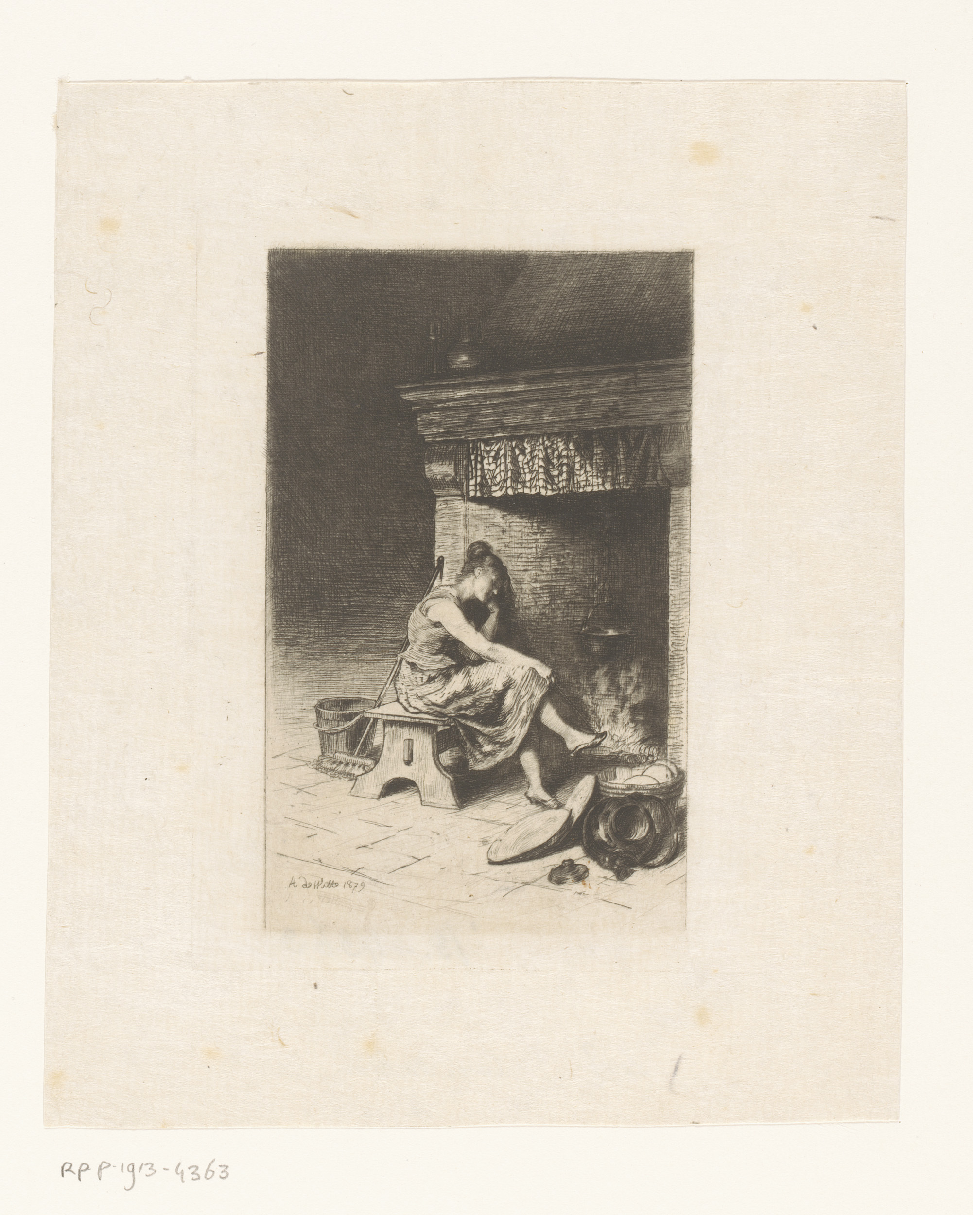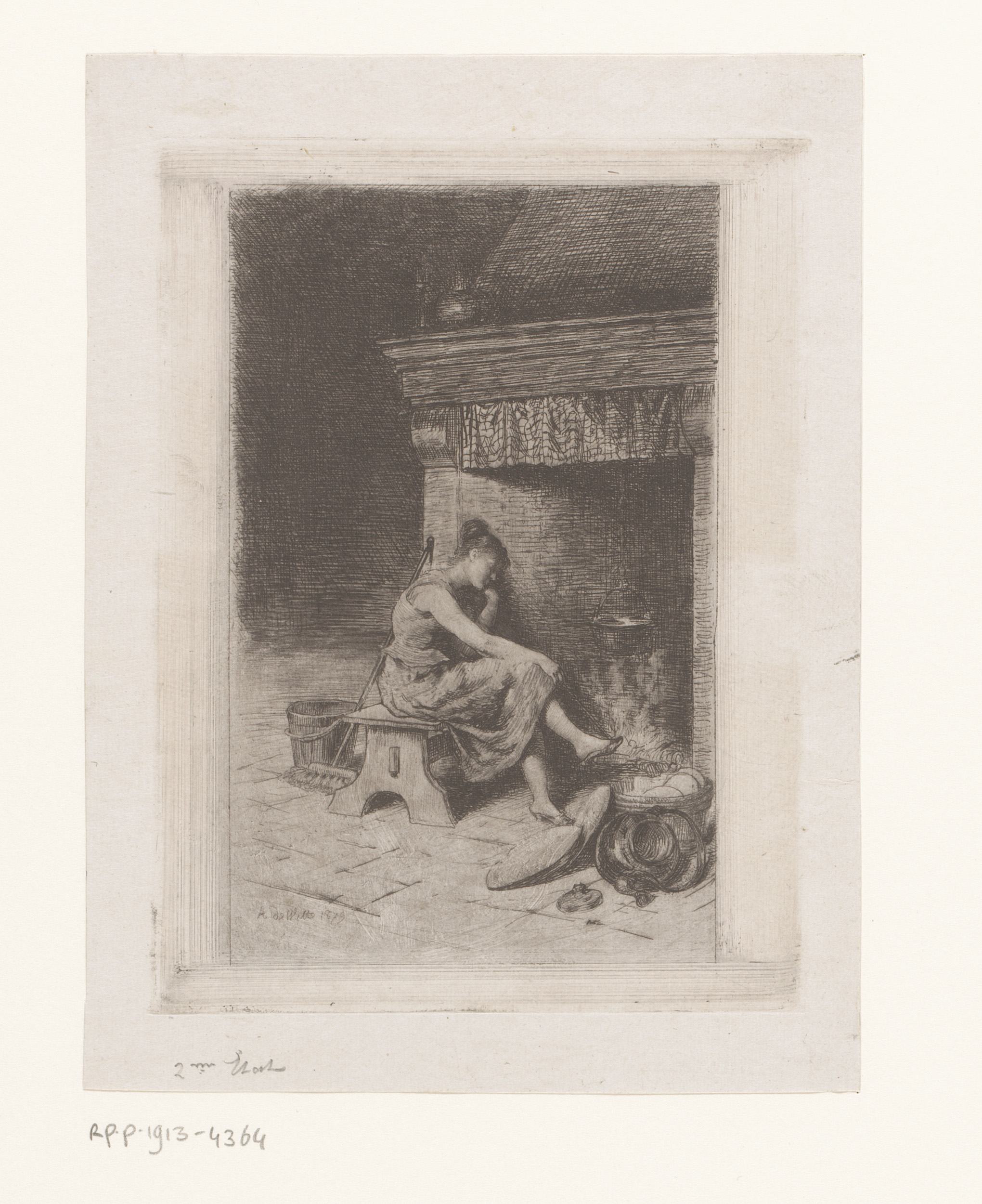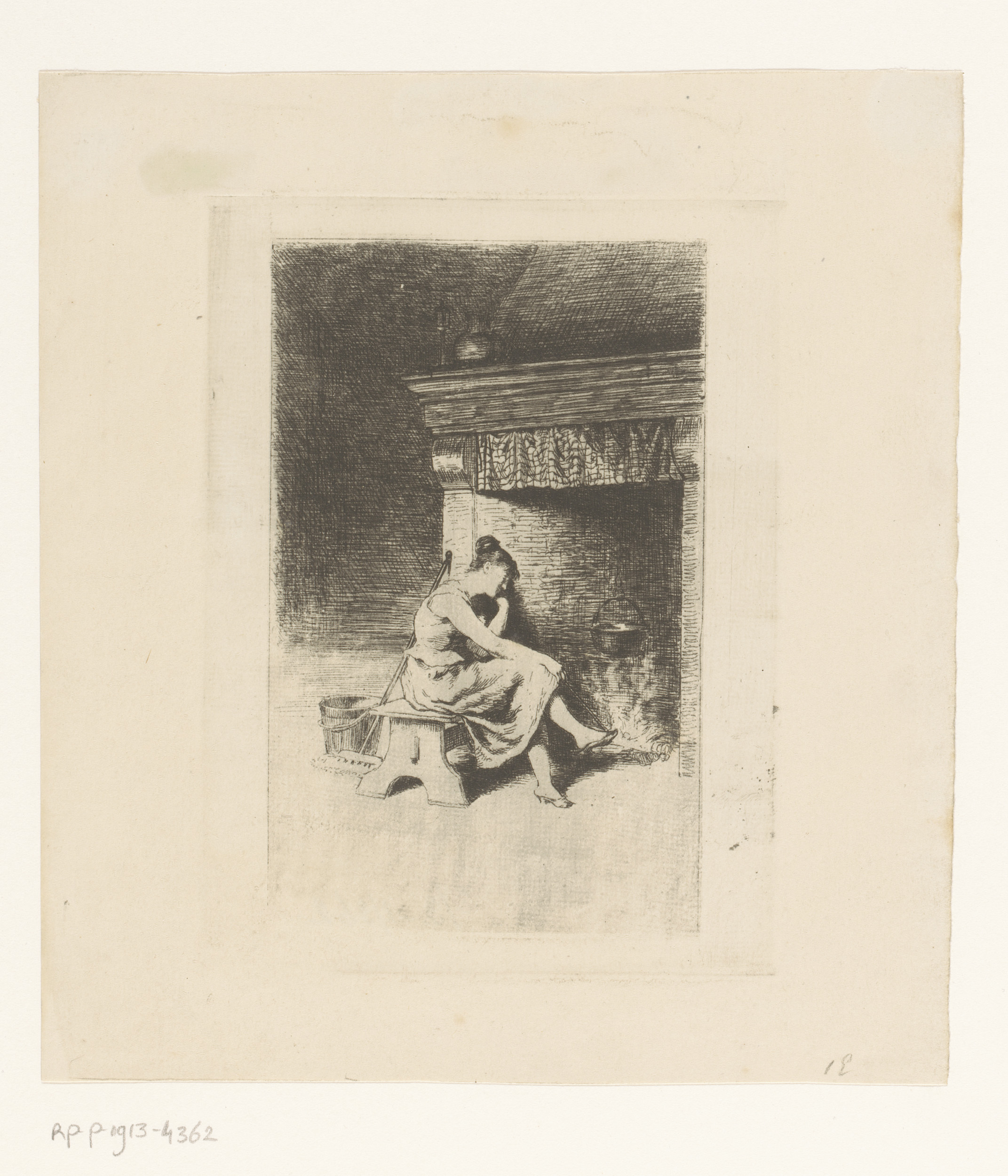 Jonge vrouw zittend bij een haard