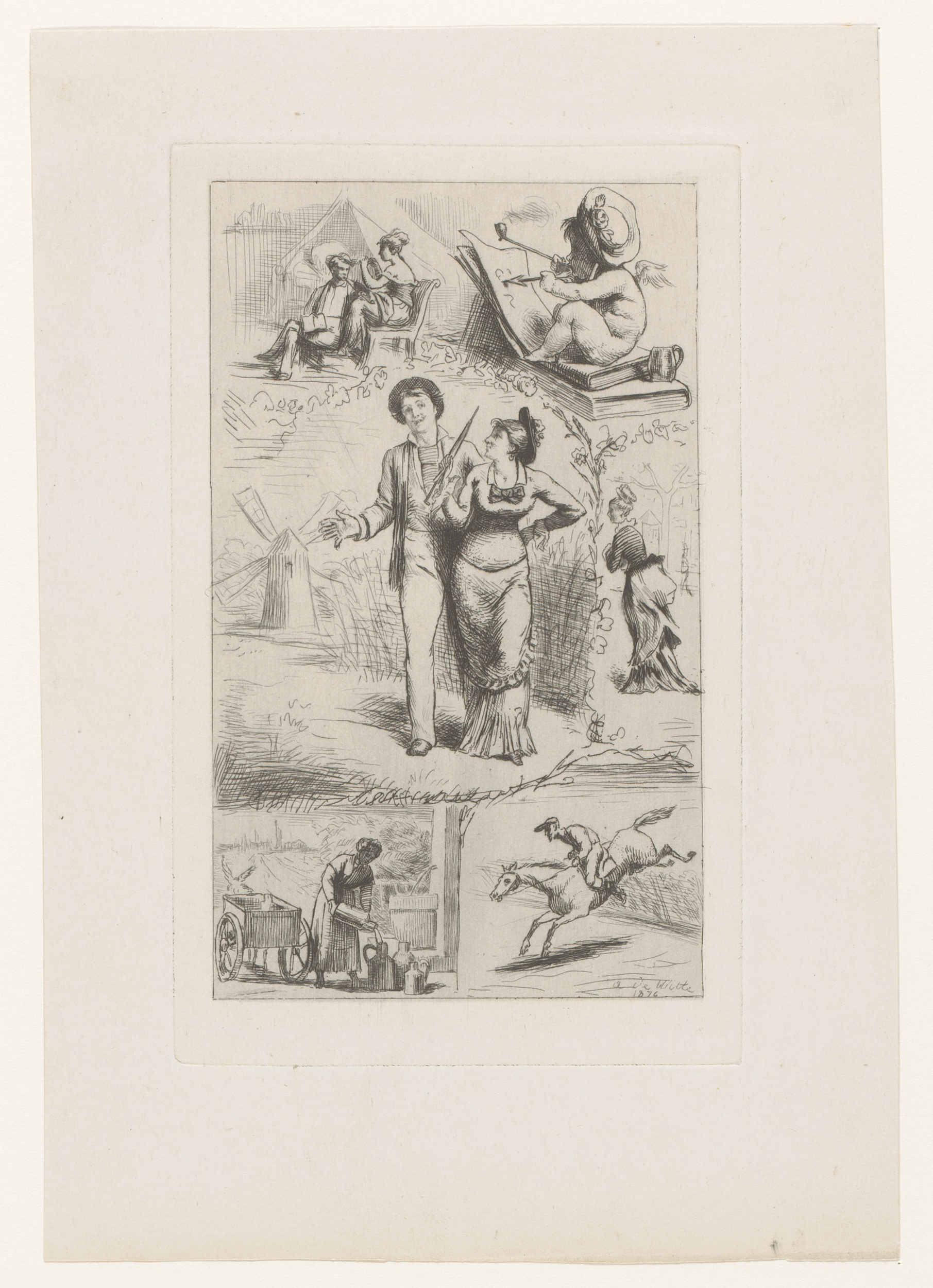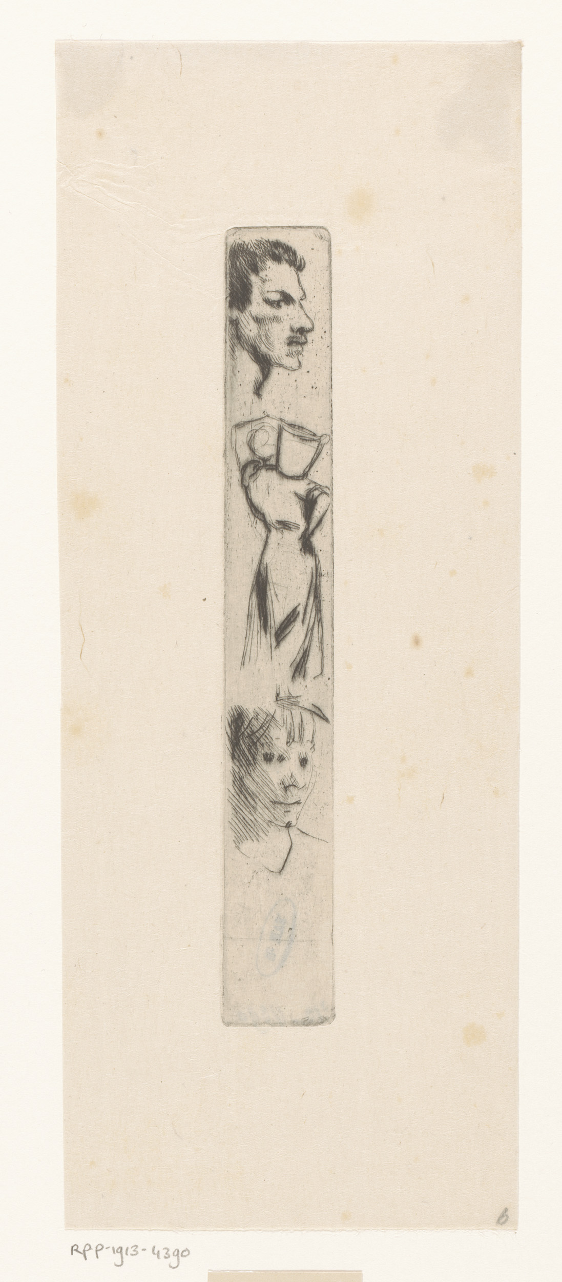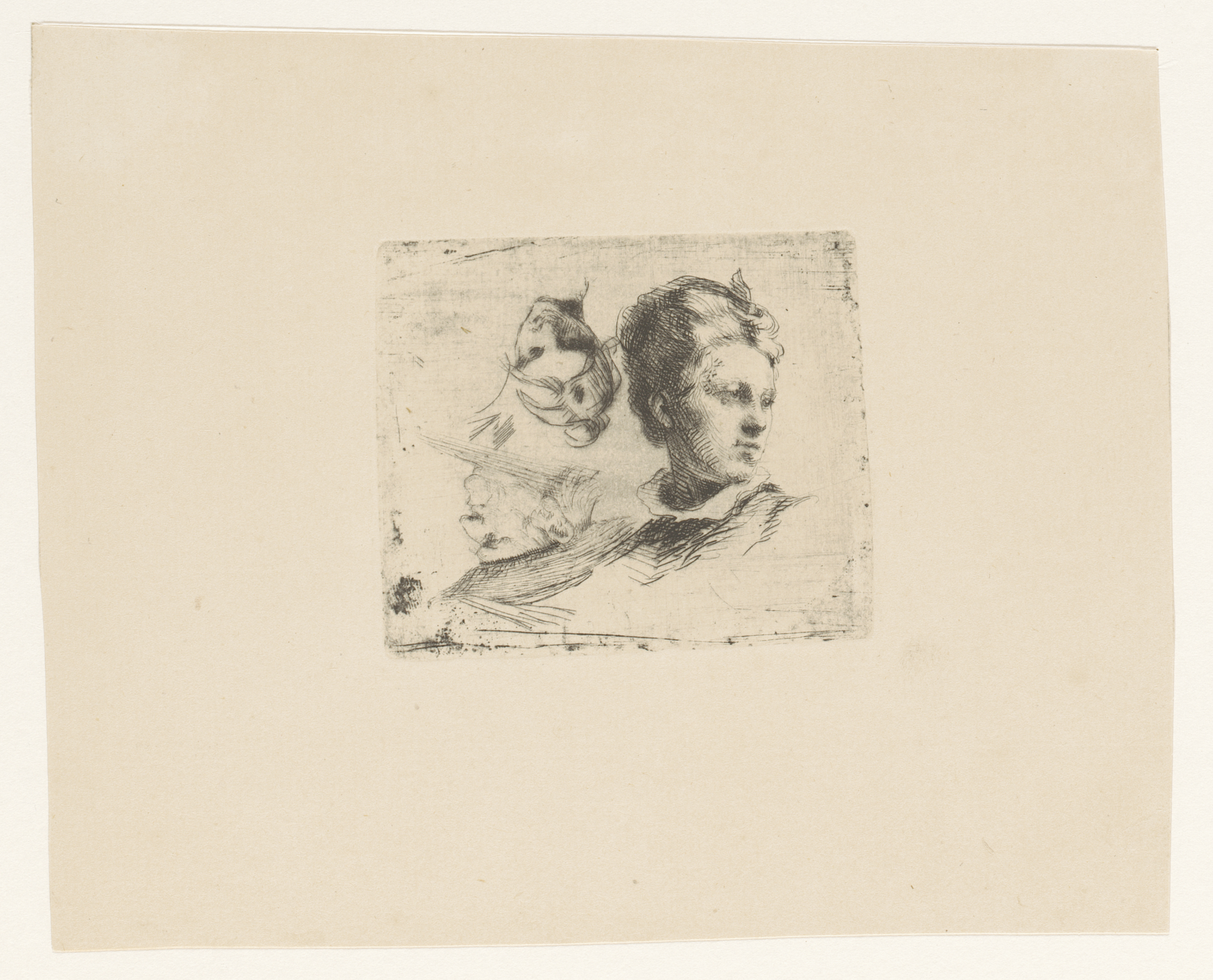 Studieblad met een vrouwenfiguur en twee mannenhoofden